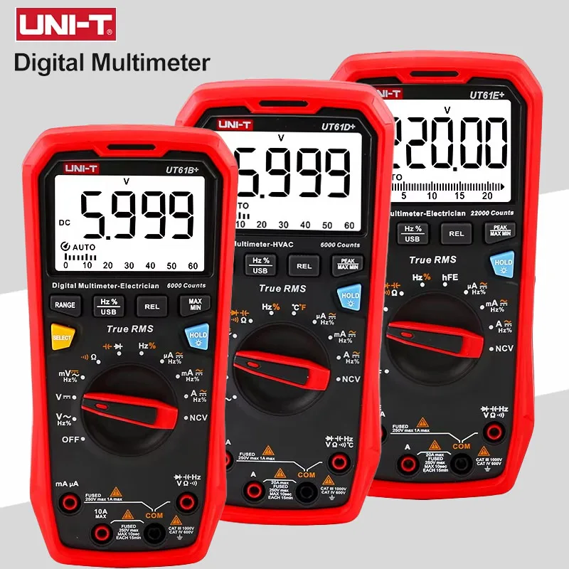 UT61+ series are reliable true RMS digital multimeters with display counts 6000 (UT61B+/D+) and 22,000 (UT61E+). It can measure up to 1000V AC/DC. Equipped with audible and visible alarm, this series can provide warning expecially when measuring high voltage/current and temperature.