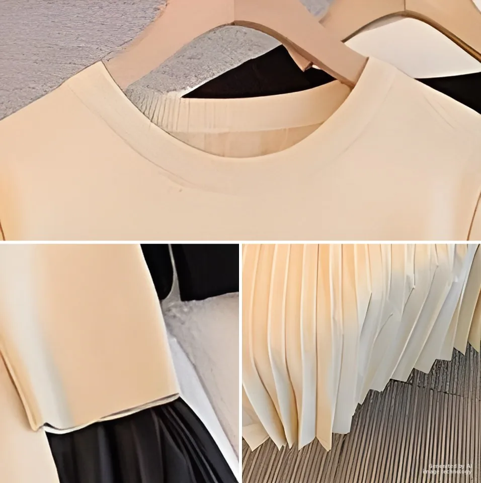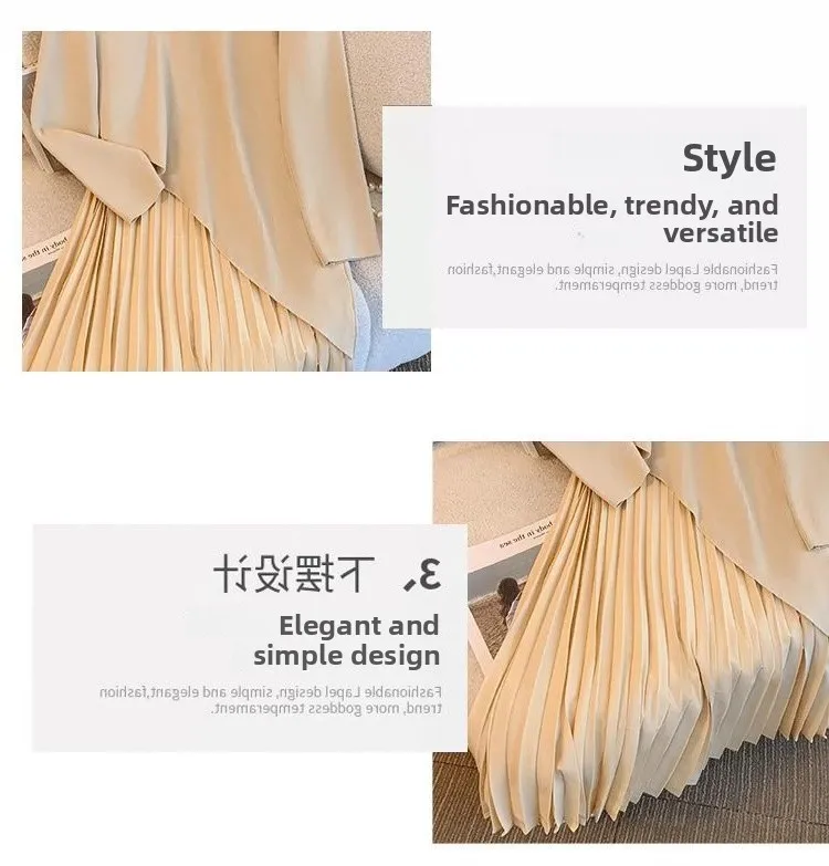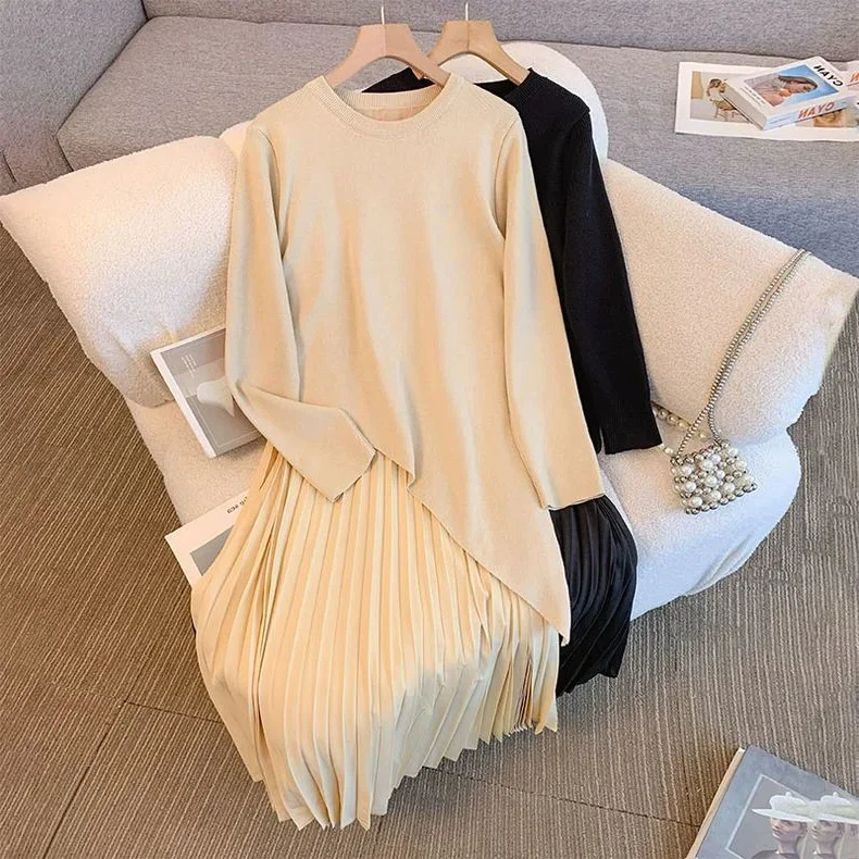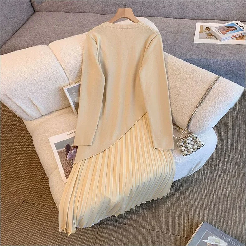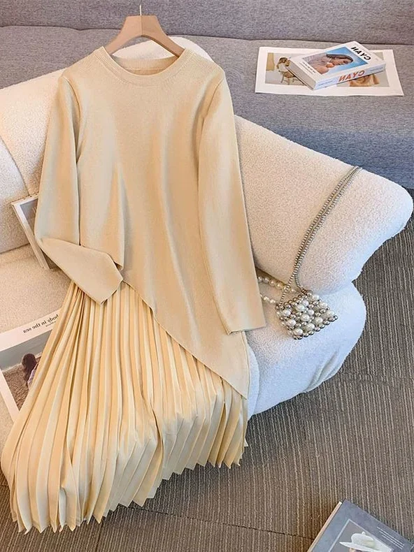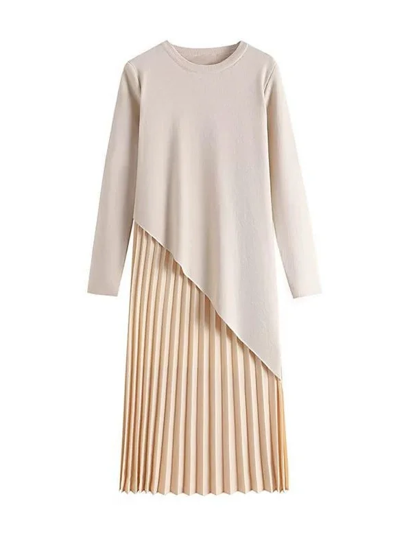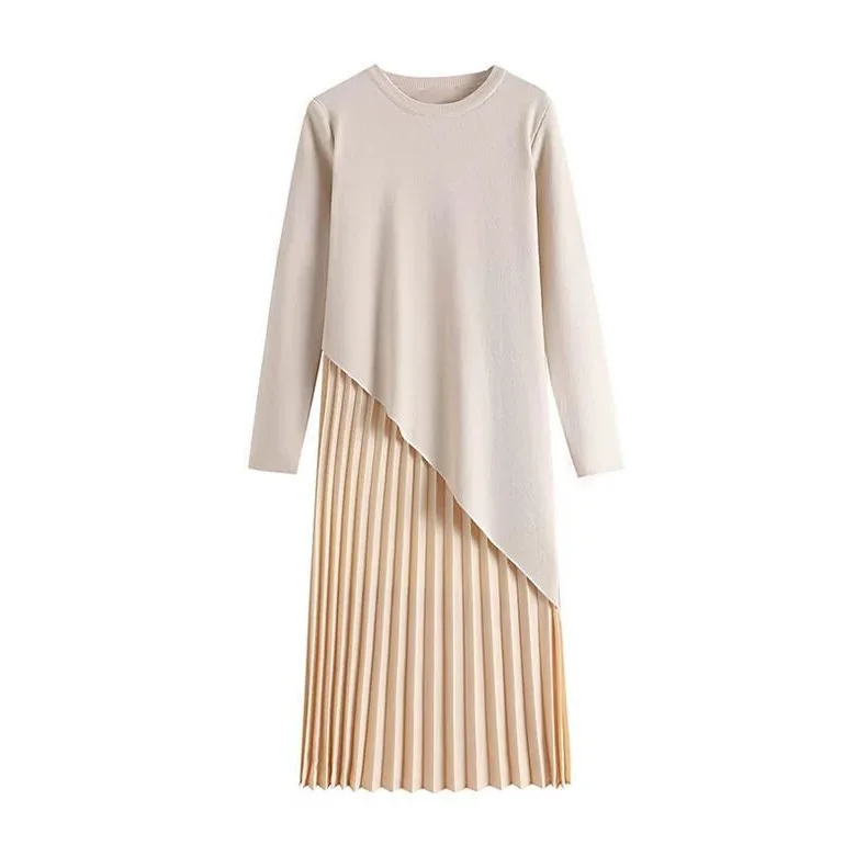 Featuring a unique loose and chic design, this dress stands out with its pleated skirt and long sleeves, perfect for the autumn season.
