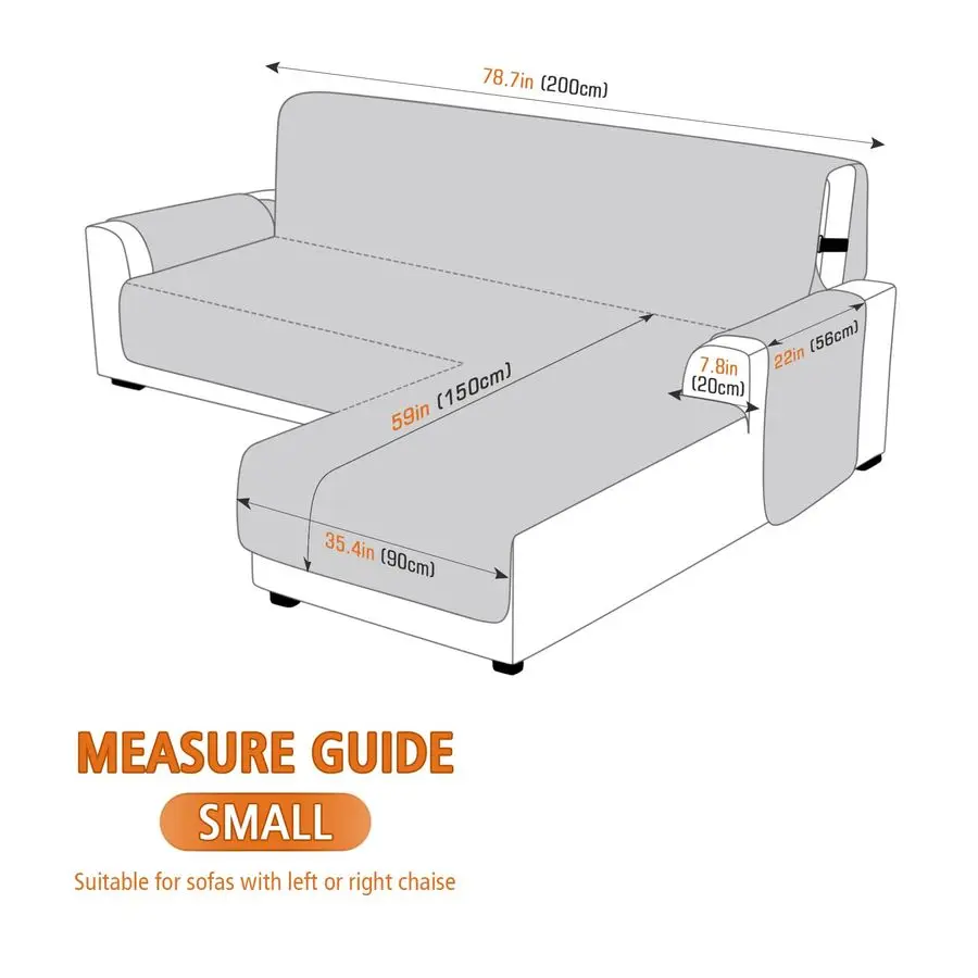DIMENSION GUIDE The L Shaped Sofa cover fits up to couch width 78.7in 200cm, chaise length 37in 94cm. VANSOFY Reversible sectional couch covers are suitable for both left and right chaise. Lshaped sofa cover come in ONE PEICE design, make it easier to install without worries. See measurement guide in images