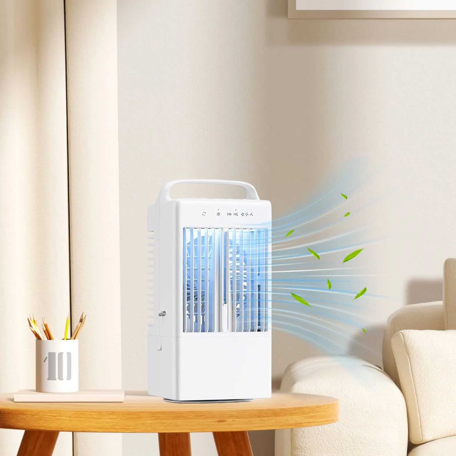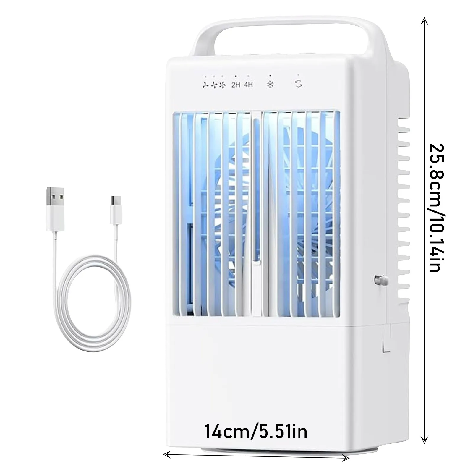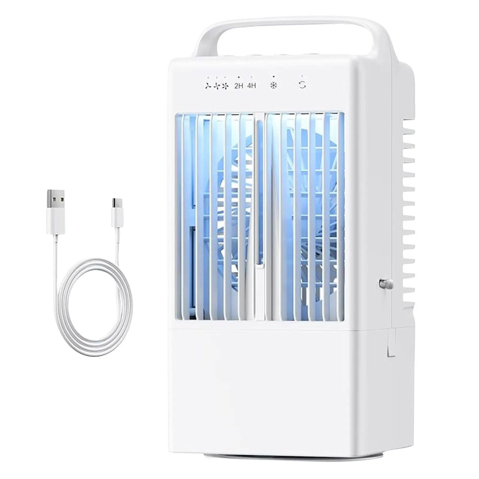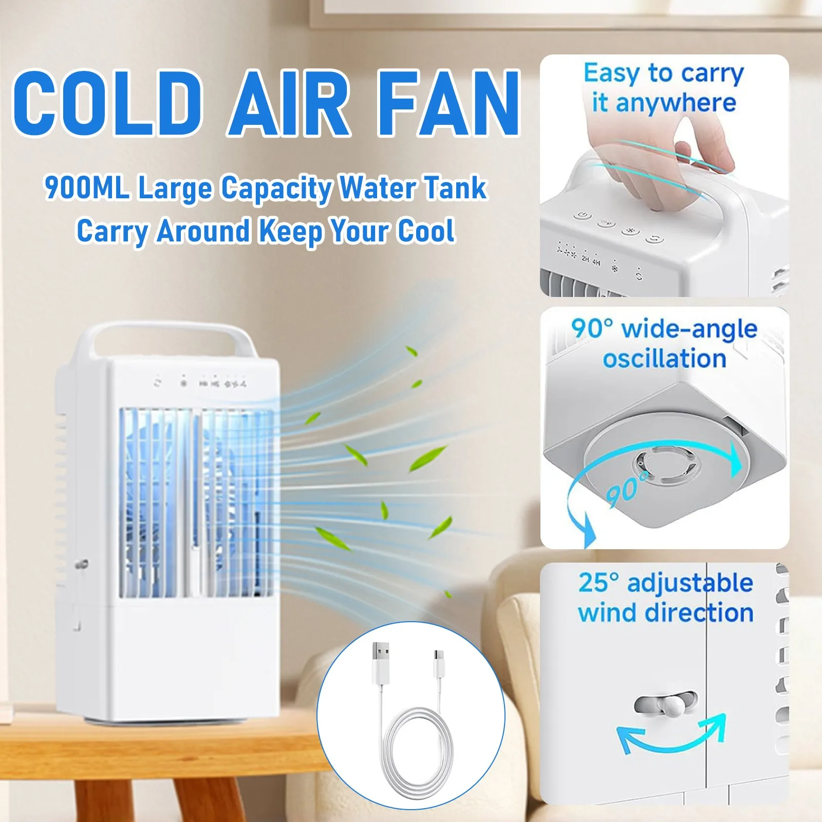 【Powerful and Fast 】This portable conditioner adopts a unique duct design, which cools efficiently and brings you a strong and cool airflow in an instant. This cooler can be used as a personal evaporative fan, conditioner and cool mist humidifier. It also comes with a 7-color LED light that doubles as a night light. You can customize the light according to your to create a peaceful atmosphere. These functions can be used alone or in combination for an excellent experience. 【3 wind speeds and adjustable wind direction】This portable cooler has 3 wind speeds (low/medium/high), you can choose suitable wind speed and enjoy your leisure time. The oscillating head of this personal conditioner can automatically rotate 90 degrees to adjust the direction of the airflow, and the can be manually adjusted up and down by 25° to put the at an ideal and comfortable angle. This conditioner has a wide coverage area and can cool you down flexibly and effectively from multiple angles. 【Large-capacity water tank and misting mode】Equipped with a 900ml sealed water tank, the fan with water mist spray can work continuously for 6-8 hours, saying goodbye to the trouble of frequent water refilling and enjoying continuous coolness. For better effect, you can add ice water and to the water tank to enhance the effect and speed up the time. One-touch to turn on the mist mode, the cool carries the water mist to moisturize your skin, and the perfect balance of and water mist brings a refreshing and comfortable feeling. [Low Noise and Timing Settings] This evaporative cooler is very suitable for and bedroom use, and its noise is less than 40 decibels. Let you immerse yourself in a cool and quiet atmosphere away from any disturbing noise. This home cooler has two intelligent timing modes of 2 hours/4 hours, which can automatically turn off during deep sleep, helping to reduce energy consumption. The 7-color changing atmosphere light can be used for night lighting, or to create a fun atmosphere when camping, bringing soft and colorful lights. [Wide Application] Our indoor cooler is equipped with a handle for easy carrying, and the conditioner fan is equipped with a USB/Type-C interface power cable, which is compatible with a variety of mobile power supplies, adapters, computers and car chargers, and can be easily charged with the included power cable. No matter where you , this portable and compact conditioner can keep you cool! This indoor cooler is designed for small rooms, offices and outdoor activities.