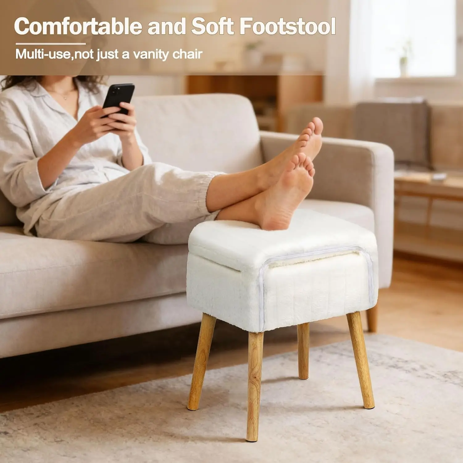 Cozy Folding Backrest – The foldable backrest saves space. It’s not just a makeup chair—when you fold it into a footstool, you can relax more comfortably while reading on the sofa or chair. When not in use, it can be stored easily under a vanity or beside a sofa.