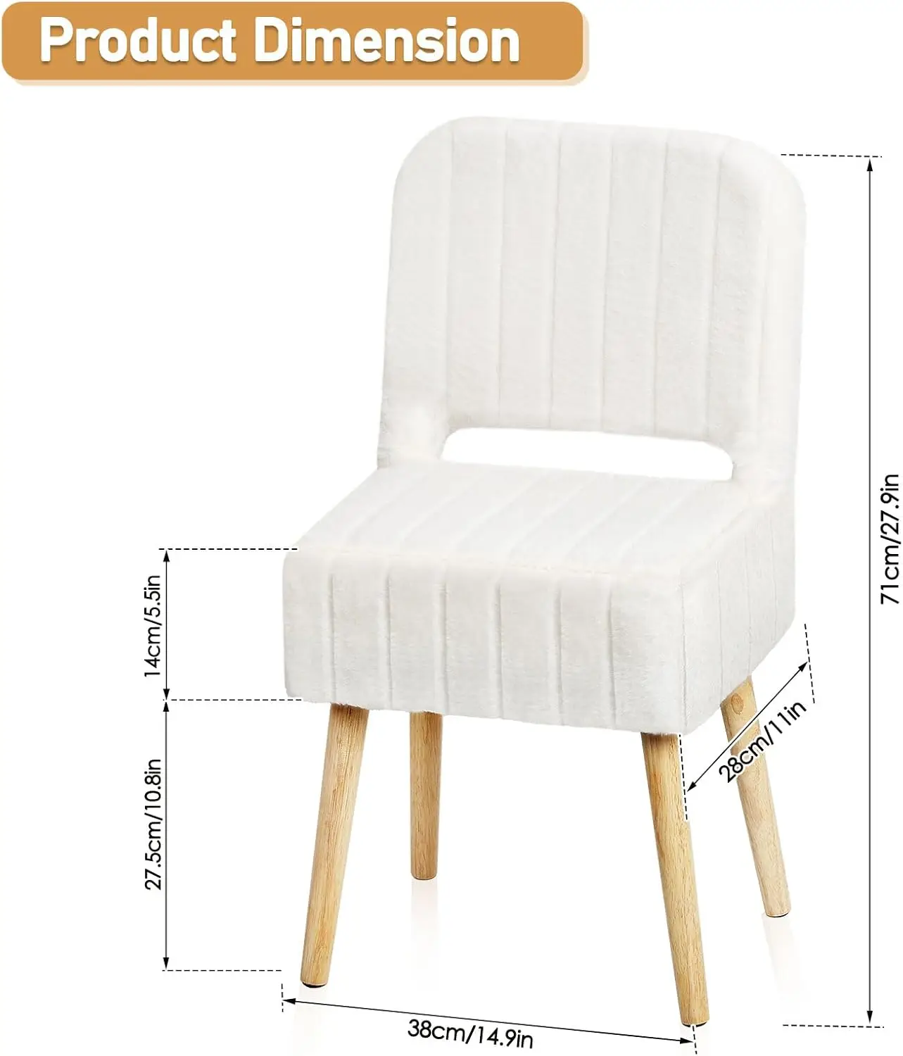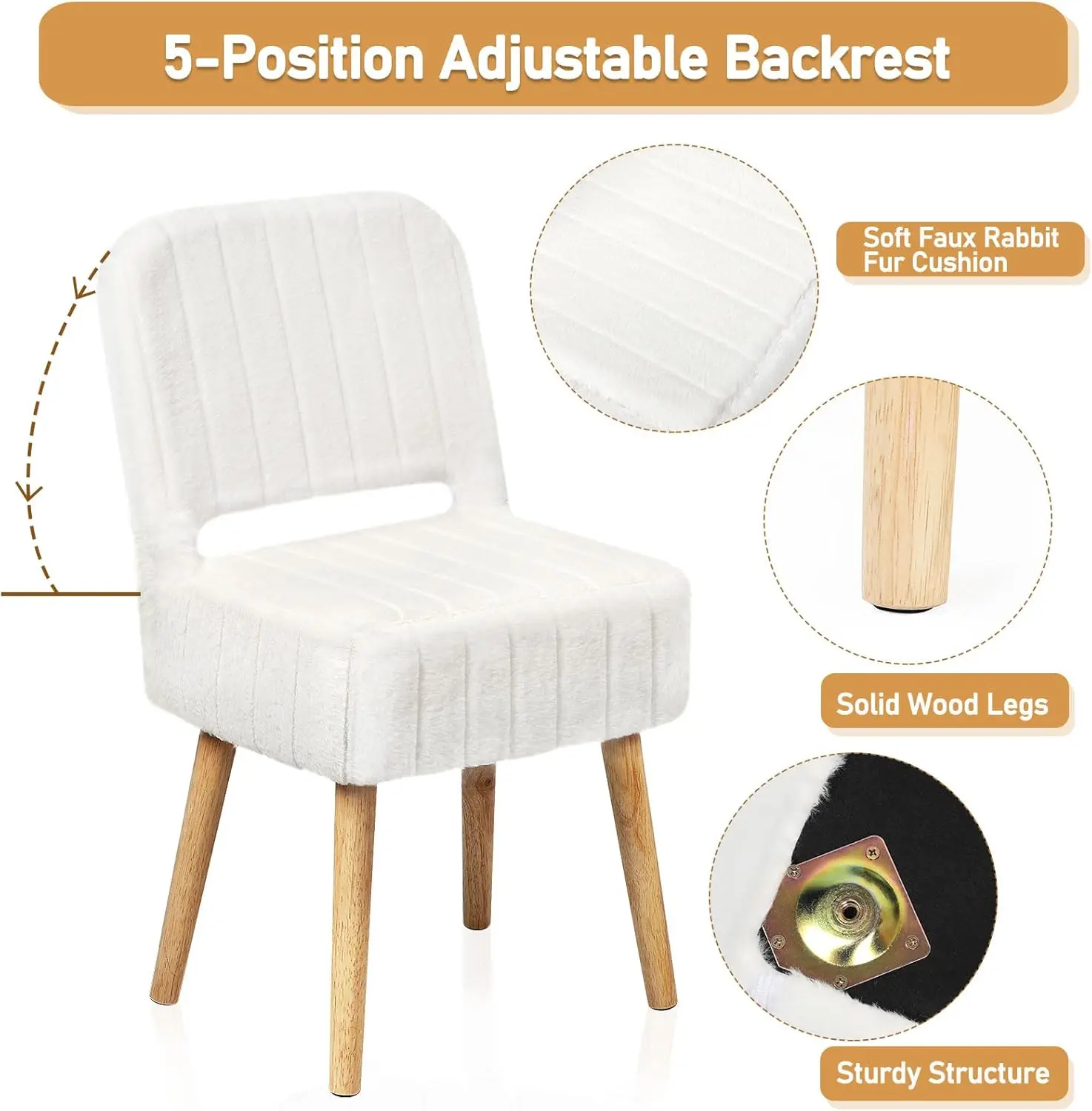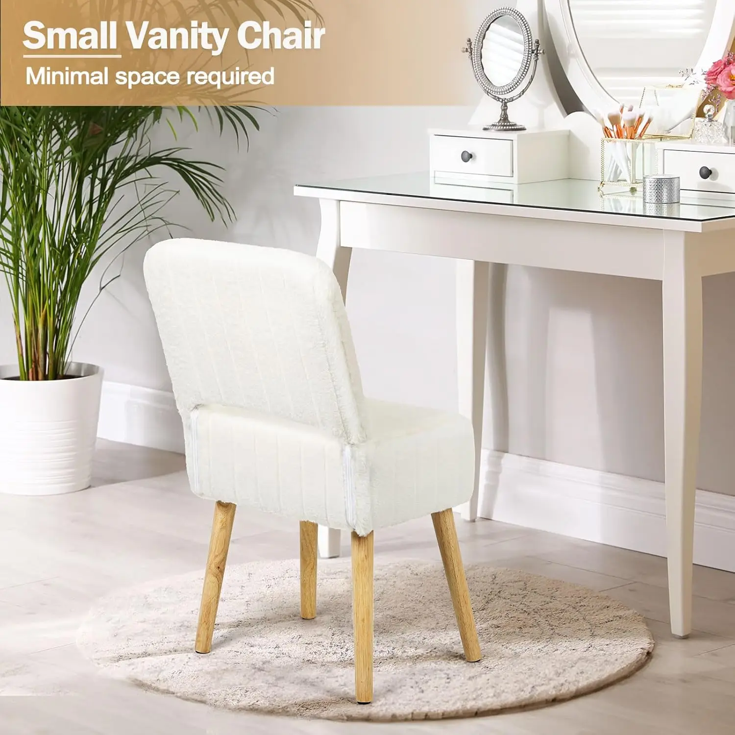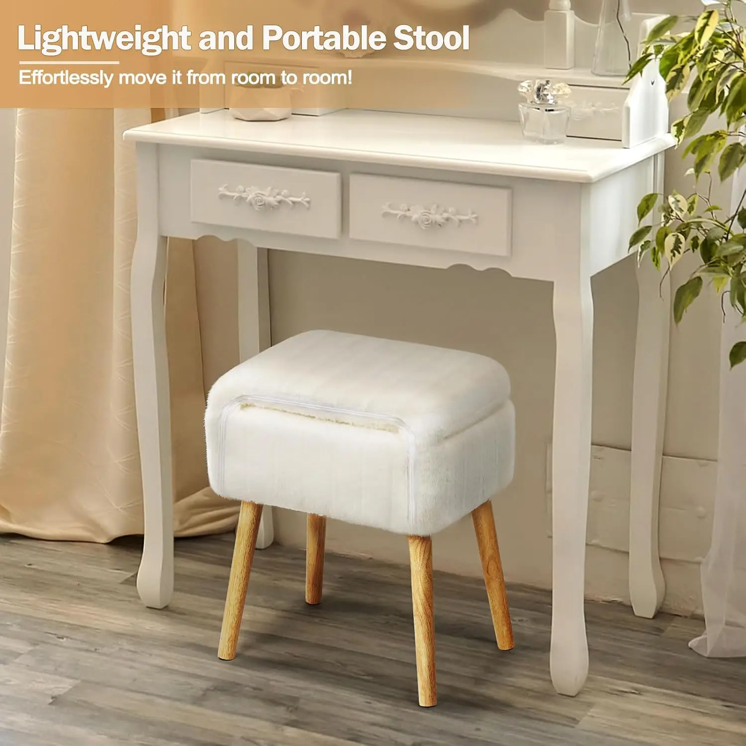 Soft Faux Rabbit Material – This small vanity stool is made from soft faux rabbit fur and has a thick foam cushion. It feels warm against the skin and significantly enhances the comfort of the seat and backrest, making it perfect for small vanity spaces.
