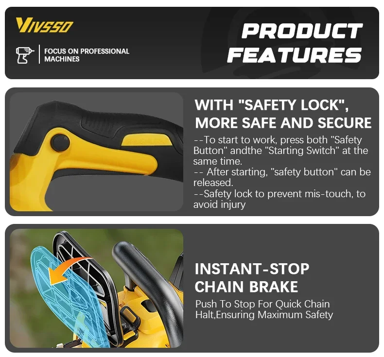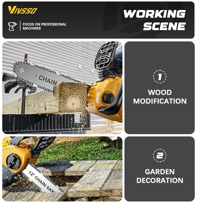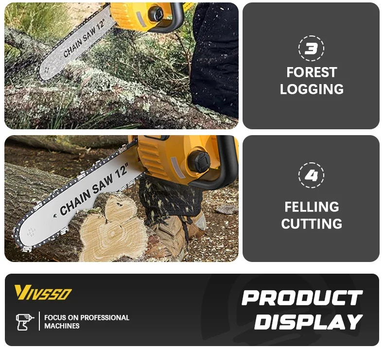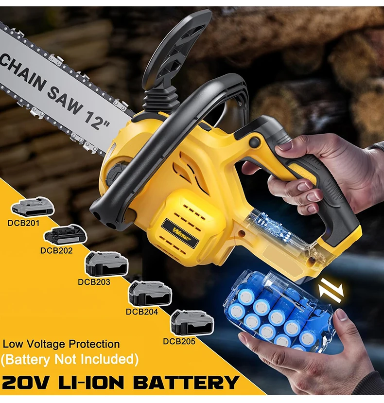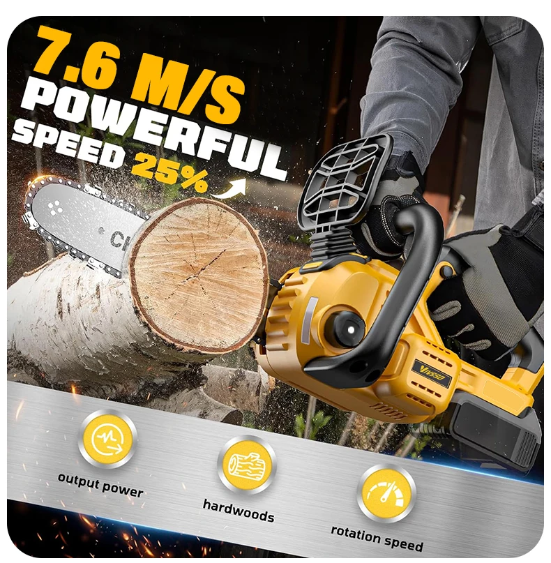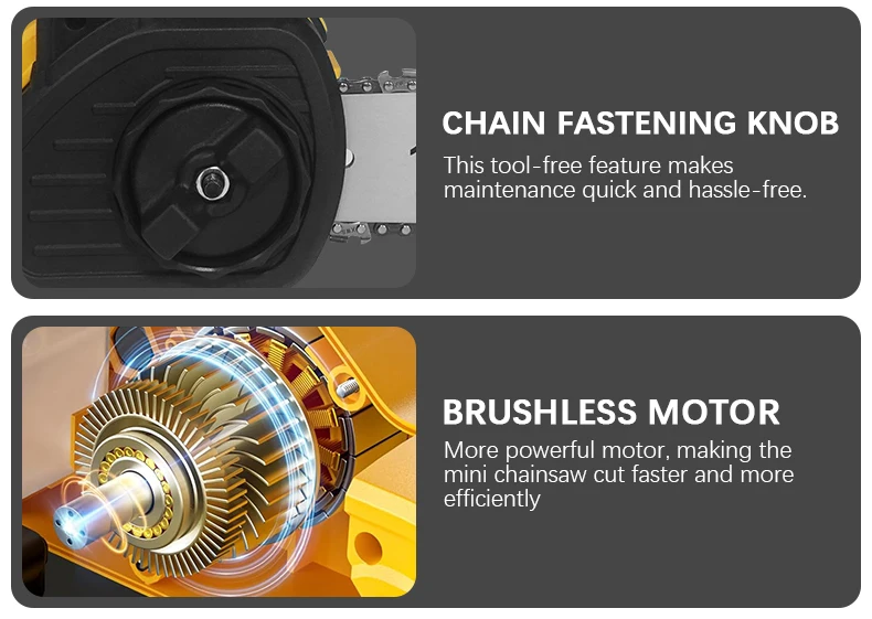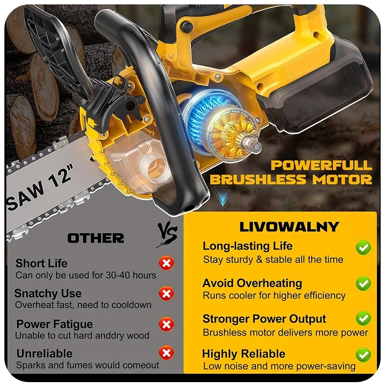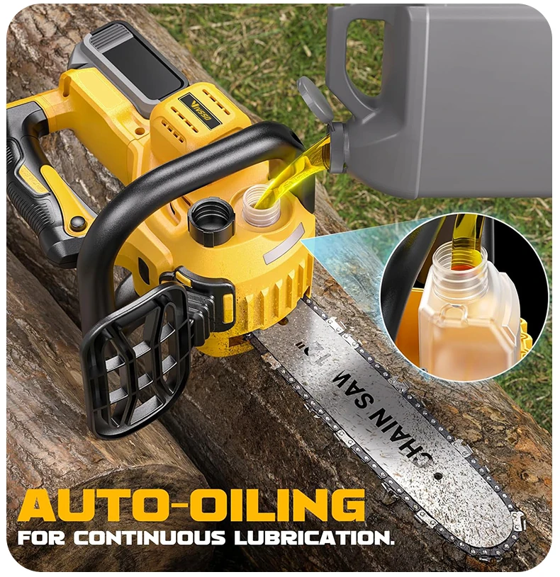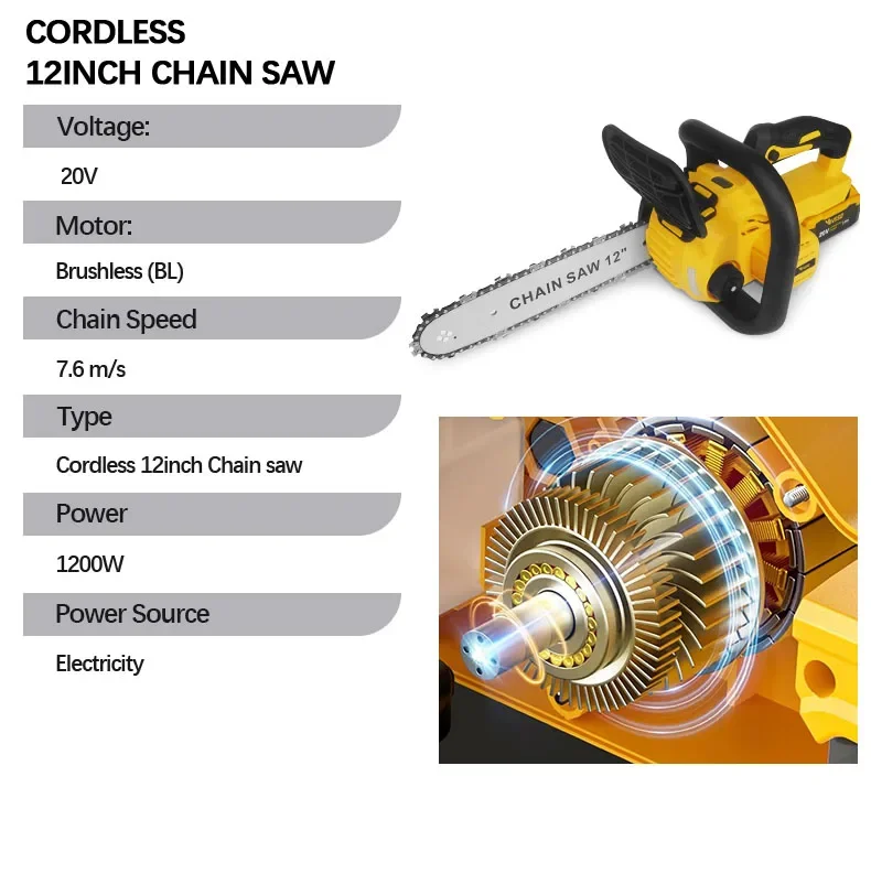 Description: Powerful brushless motor: Equipped with a 1200W pure copper brushless motor, the chainsaw delivers exceptional performance. Deep-hardened guide chain and high chain speed ensure faster, smoother, and more efficient cutting. Automatic tensioning and automatic lubrication: Enjoy hassle-free operation with this battery-powered chainsaw. The tool-free chain tensioning system achieves optimal chain tension in seconds—no tools required. Combined with automatic chain lubrication, you get smooth performance, easy maintenance, and a seamless cutting experience every time. Low voltage protection and tool-free tensioning: Built-in low voltage protection extends battery life. Easily adjust chain tension with the tool-free tensioning system to ensure perfect tension for smooth, precise cutting—no hassle, minimal maintenance, and maximum performance.
