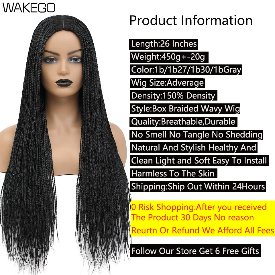 Wakego Box Braided Wigs for Black Women 26" Long Braids Wigs Fake Scalp Synthetic Heat Resistant Fiber Micro Braid Wig Daily Use