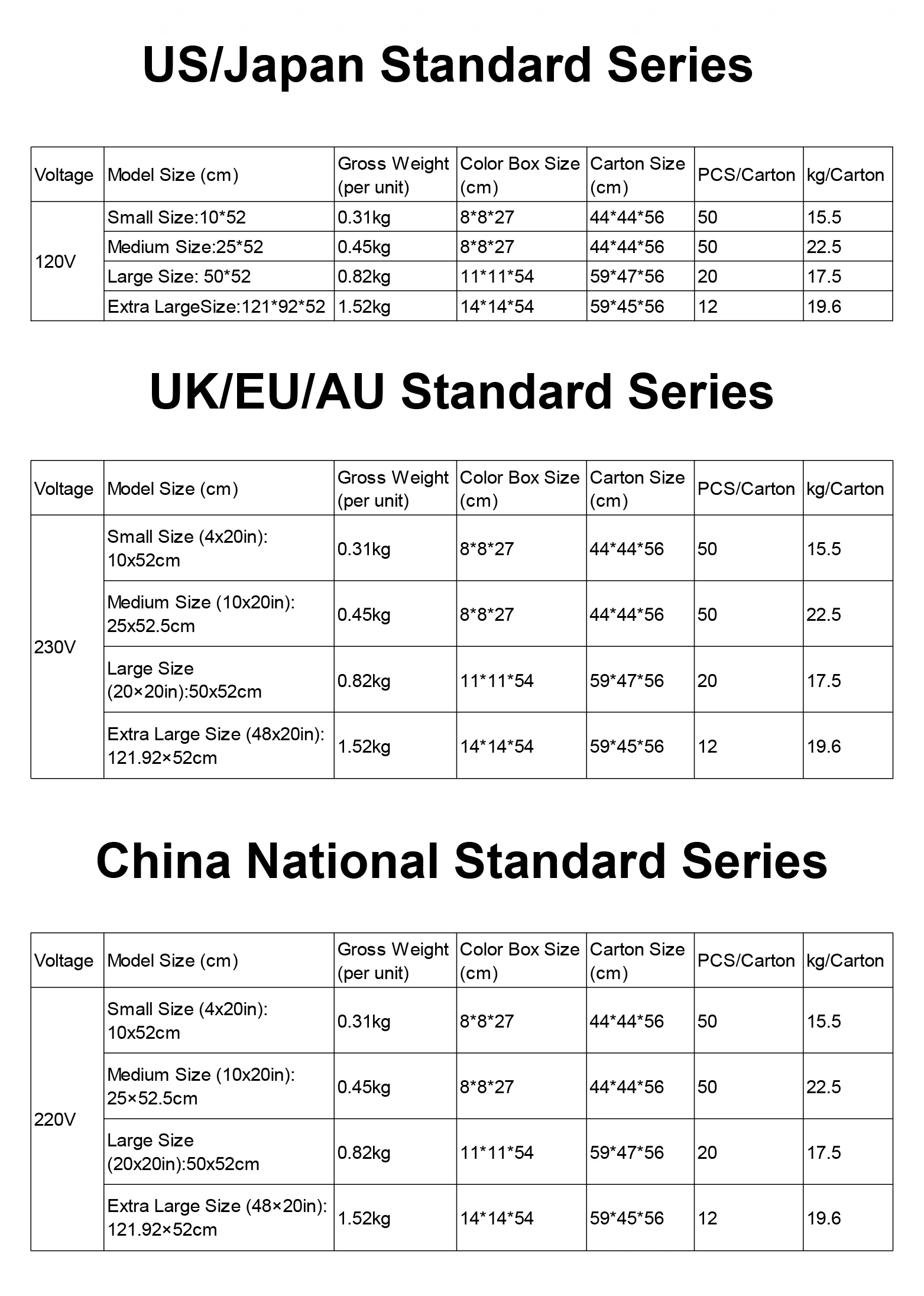Please confirm the required power standard and size before placing your order.