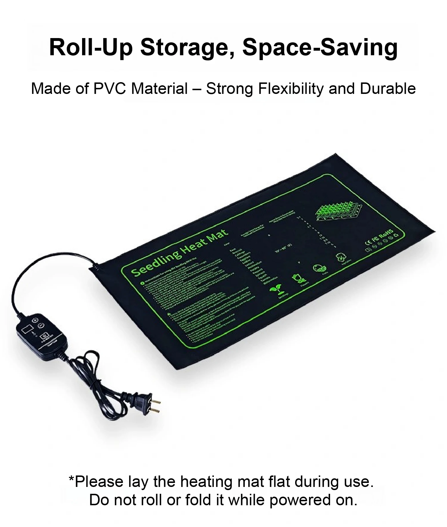 Please lay the heating pad flat during use. Do not fold or roll while powered on.