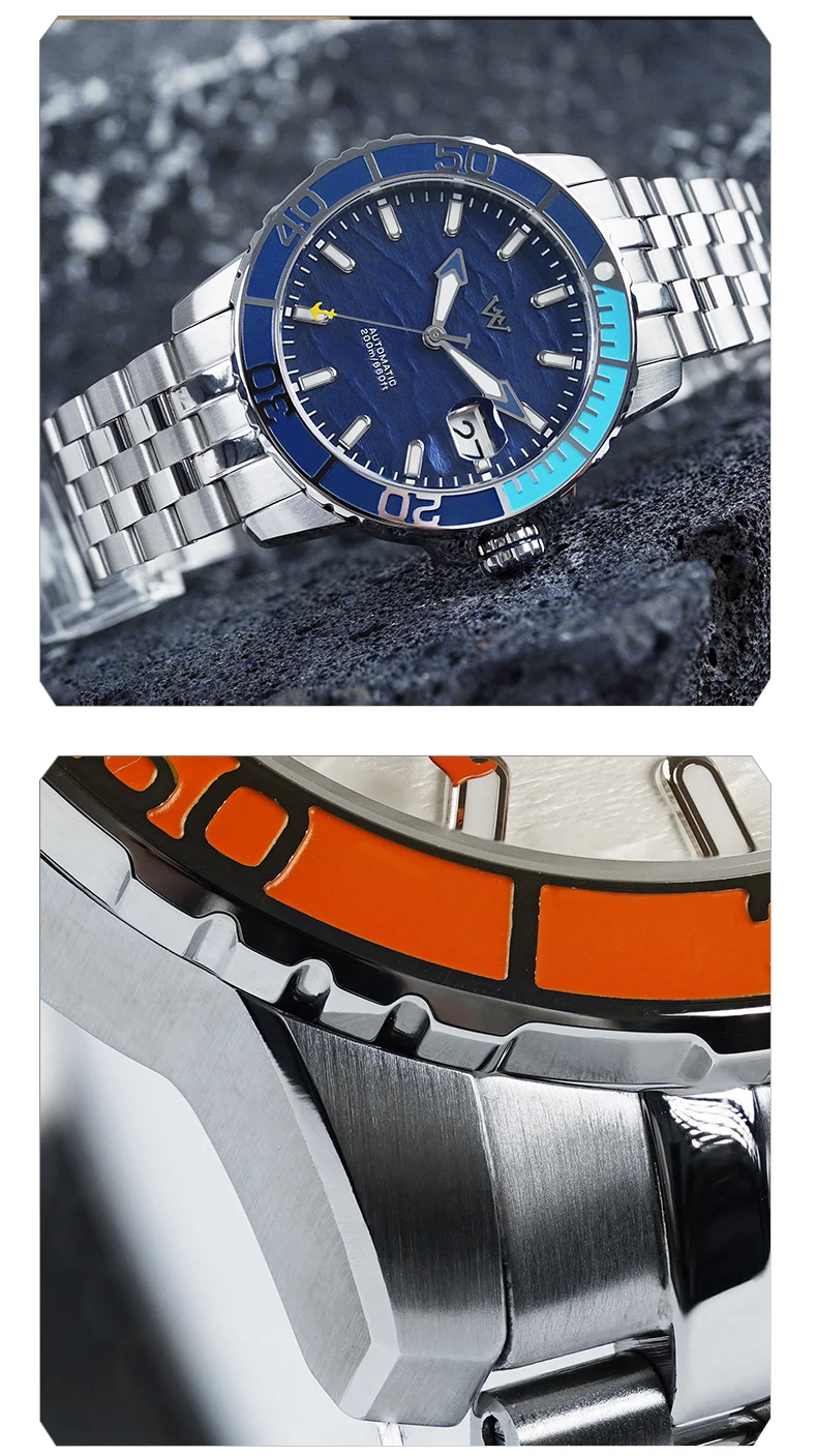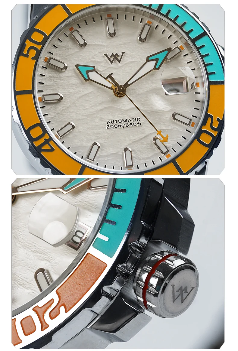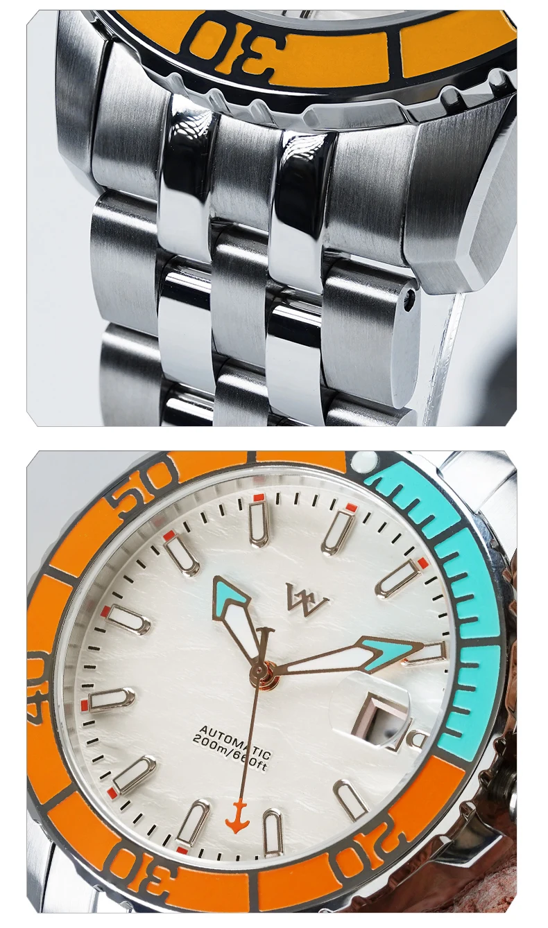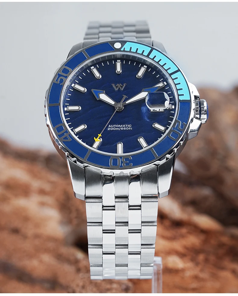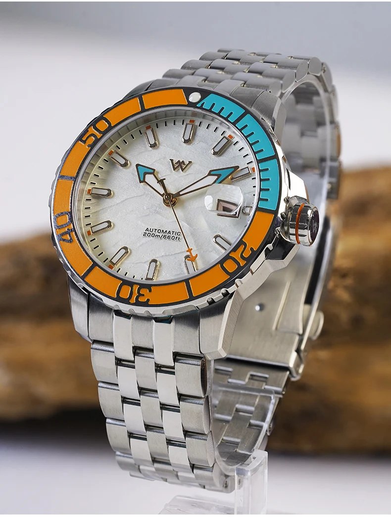 A very well-made, eye catching 200mtrs diving watch, carefully regulated +2sec/day, no sharp edges including bracelet and clasp. Easy to shorten. The bezel is cleanly milled, polished and inlaid. A large, well-protected crown and very good luminescence. Diameter all over 45mm. Fast delivery. What more could you want? My 3rd welly merck watch.