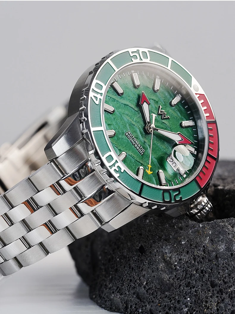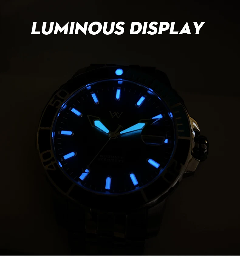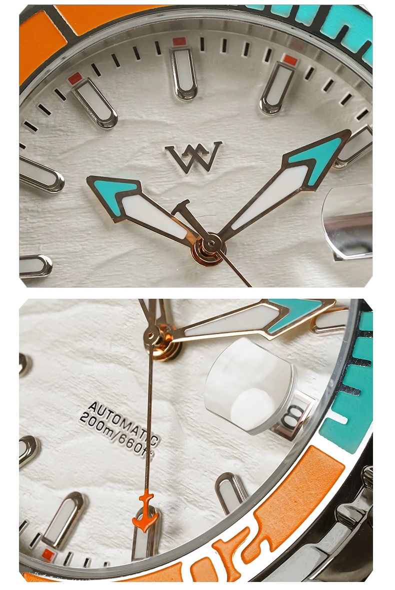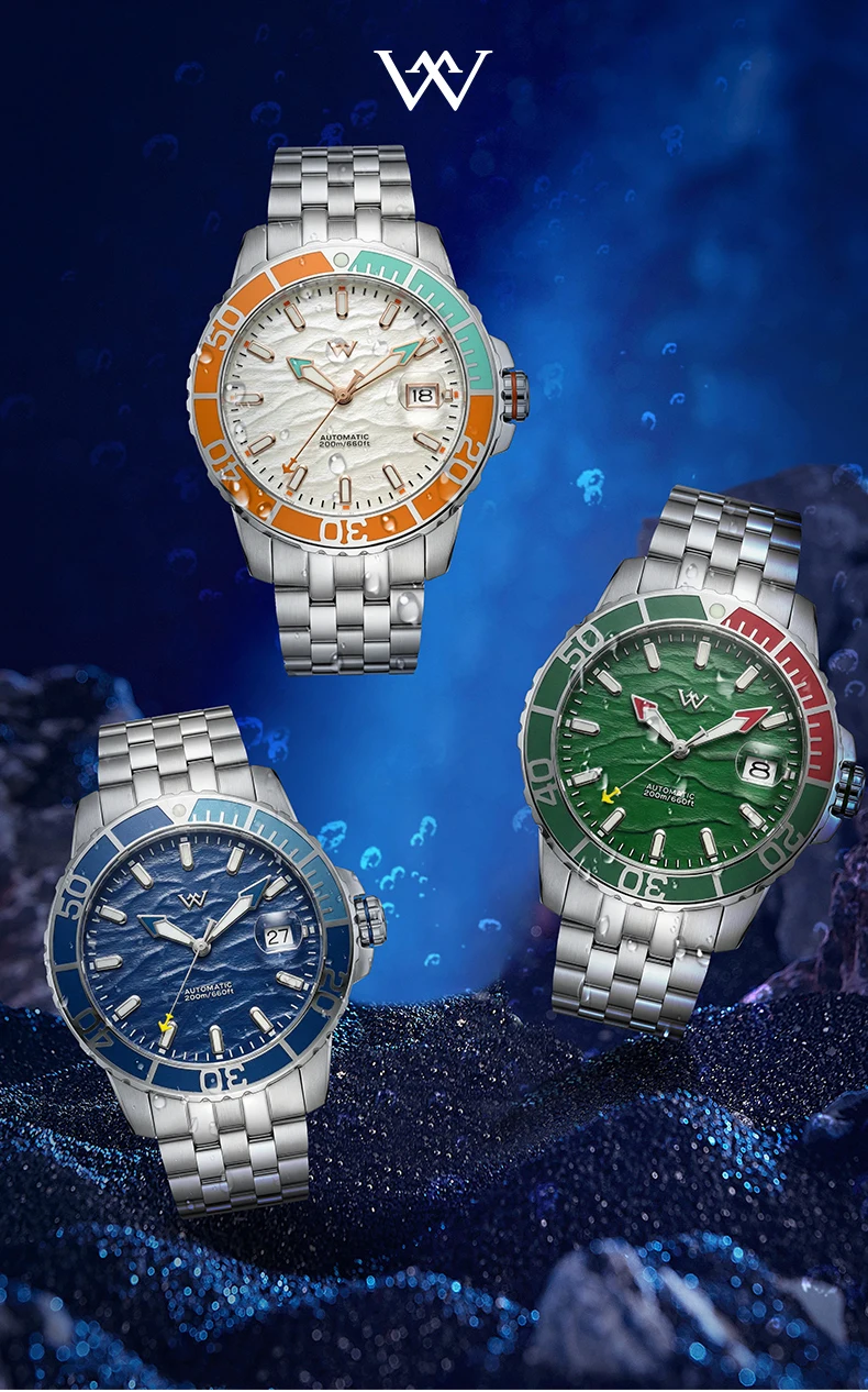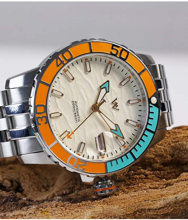 A very well-made, eye catching 200mtrs diving watch, carefully regulated +2sec/day, no sharp edges including bracelet and clasp. Easy to shorten. The bezel is cleanly milled, polished and inlaid. A large, well-protected crown and very good luminescence. Diameter all over 45mm. Fast delivery. What more could you want? My 3rd welly merck watch.