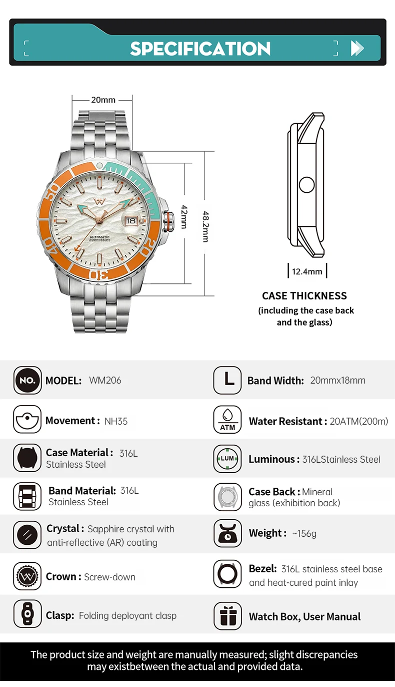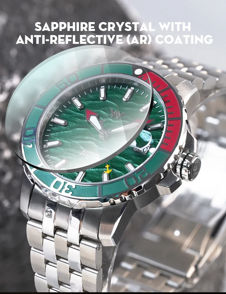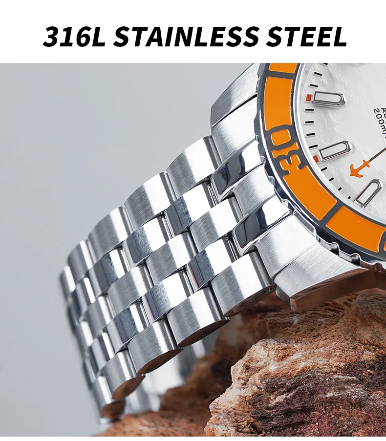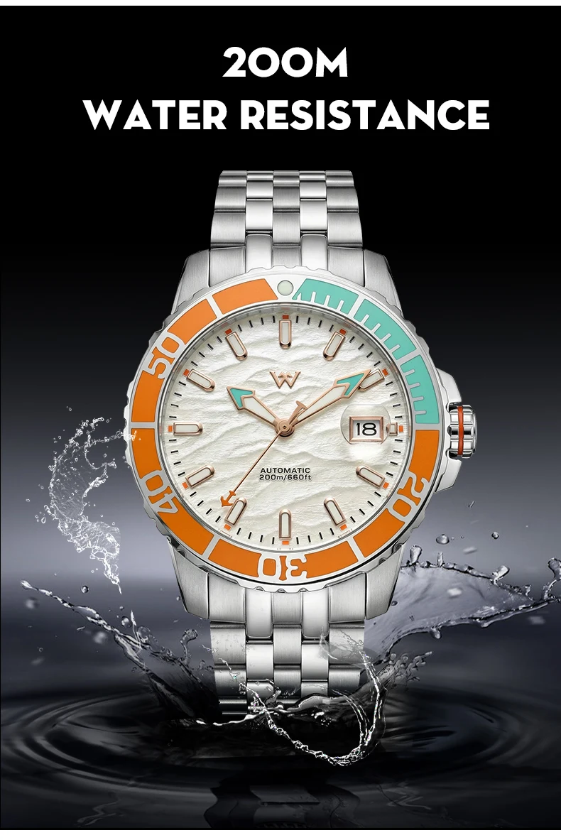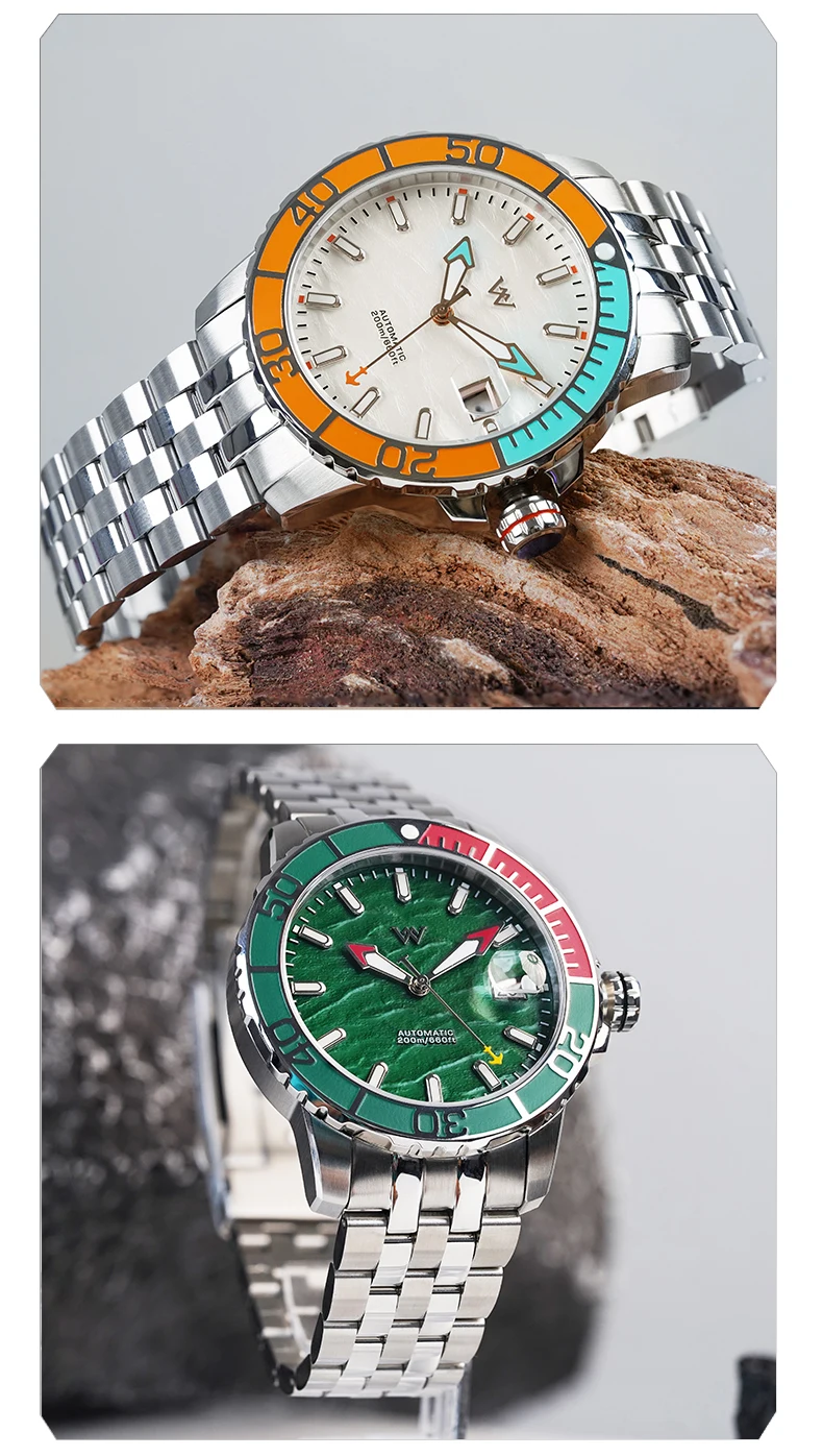 A very well-made, eye catching 200mtrs diving watch, carefully regulated +2sec/day, no sharp edges including bracelet and clasp. Easy to shorten. The bezel is cleanly milled, polished and inlaid. A large, well-protected crown and very good luminescence. Diameter all over 45mm. Fast delivery. What more could you want? My 3rd welly merck watch.