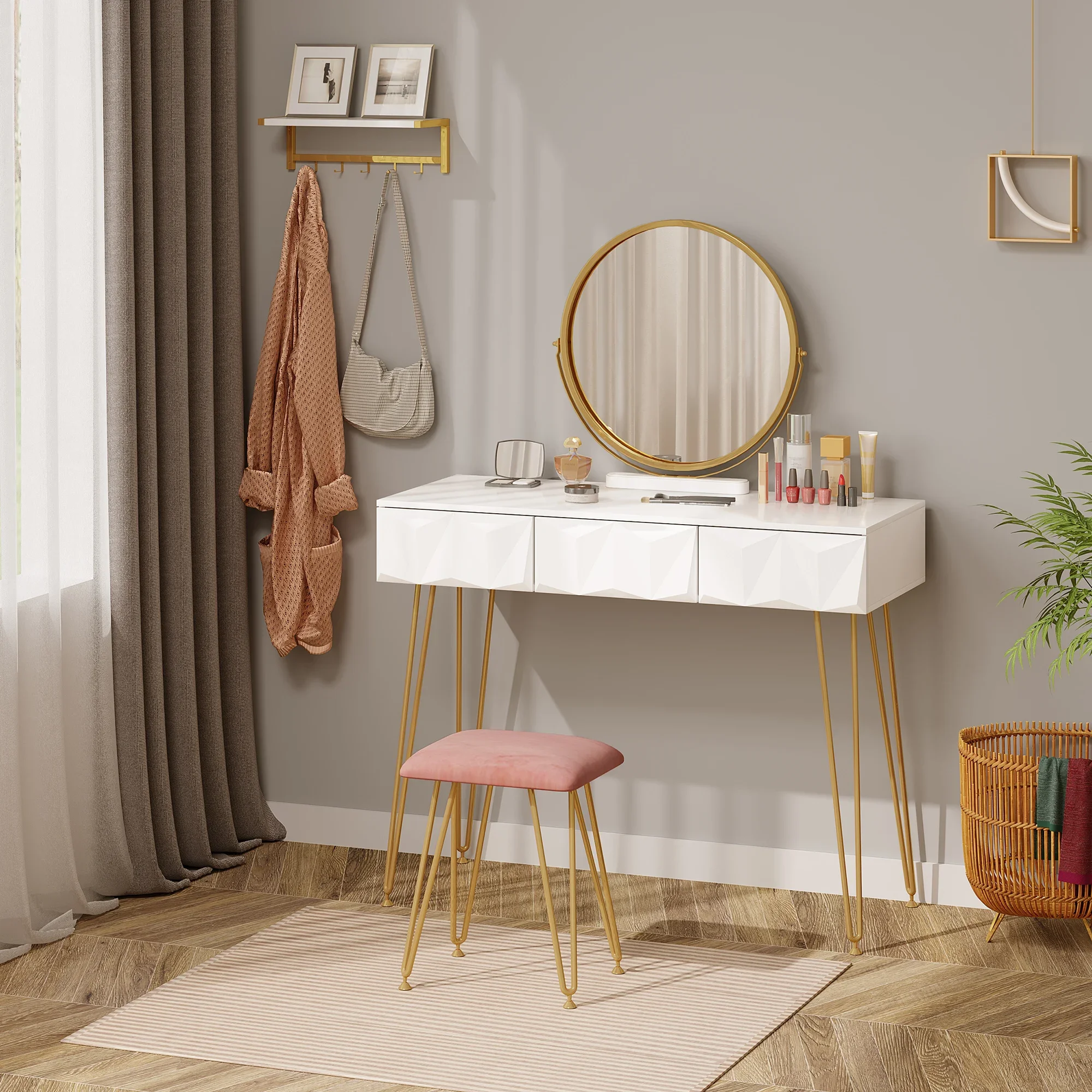 TRENDY METAL FRAME: The makeup mirror frame and base are made of metal, shiny and lustrous, adding value and durability to the product. The surface of the drawer is designed with 3D texture, which makes the whole dressing table more advanced. The legs of the table and the stool are gilded and have delicate arches. Against the background of the feet, the white dressing table looks more striking.