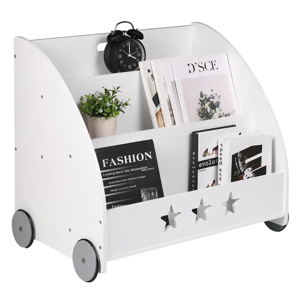 [Large storage space]: ❤ The bookcase is trapezoidal with 3 compartments of different sizes in the front (height: 26/24 / 33CM), books of different sizes can be stored reasonably. There is a hidden storage space at behind the library. With this bookcase, your child will learn to read and tidy up.