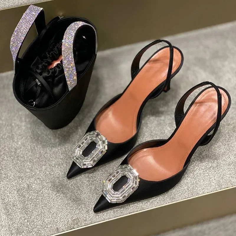 椭圆水钻扣包头凉鞋2023开春新款欧美名媛尖头细跟中空宴会高跟鞋