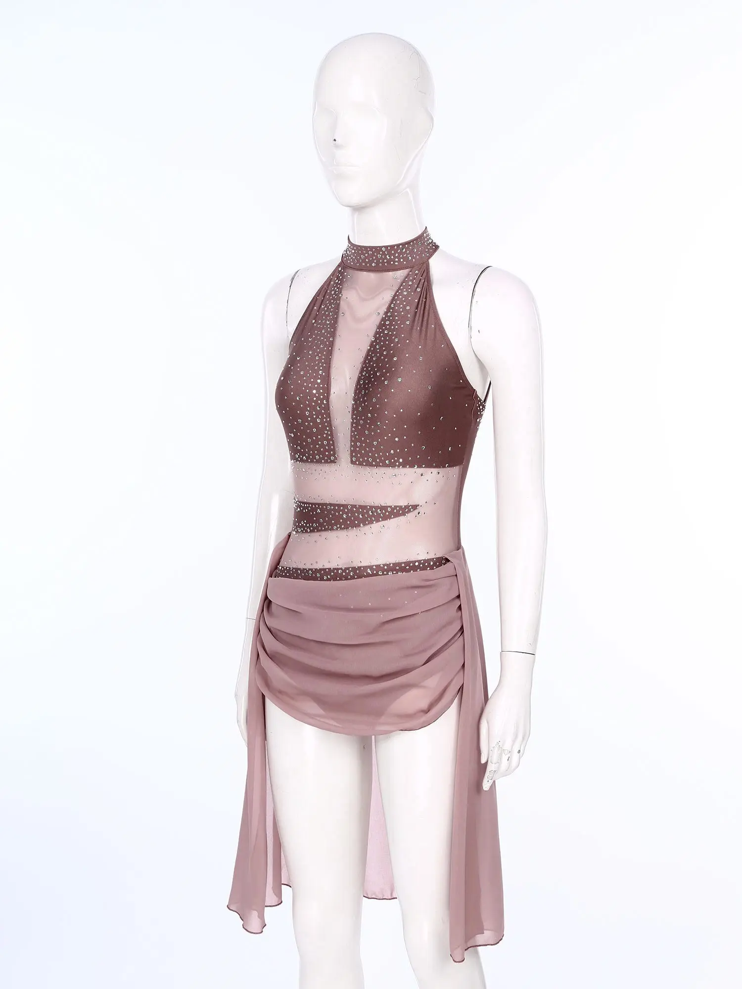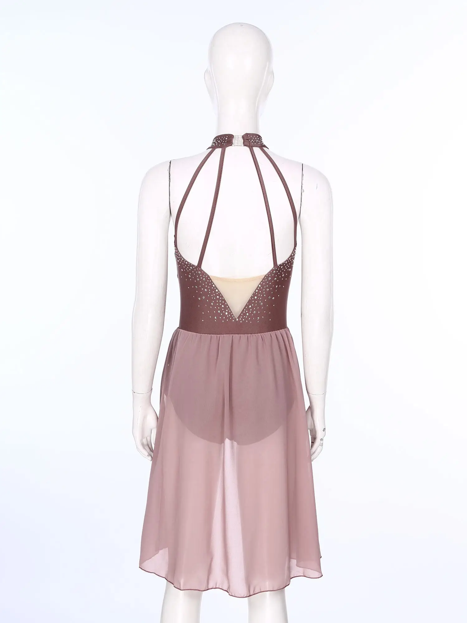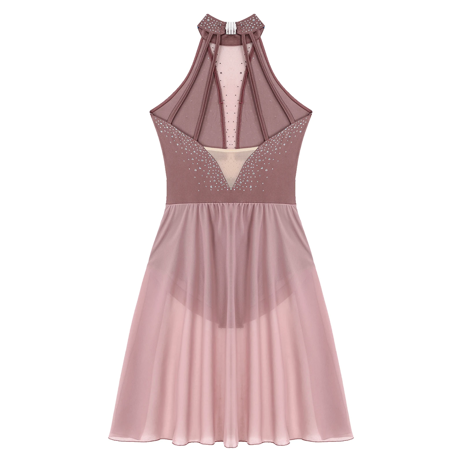 Women’s sleeveless dance dress with rhinestones that sparkle under the light to brighten up any performance.