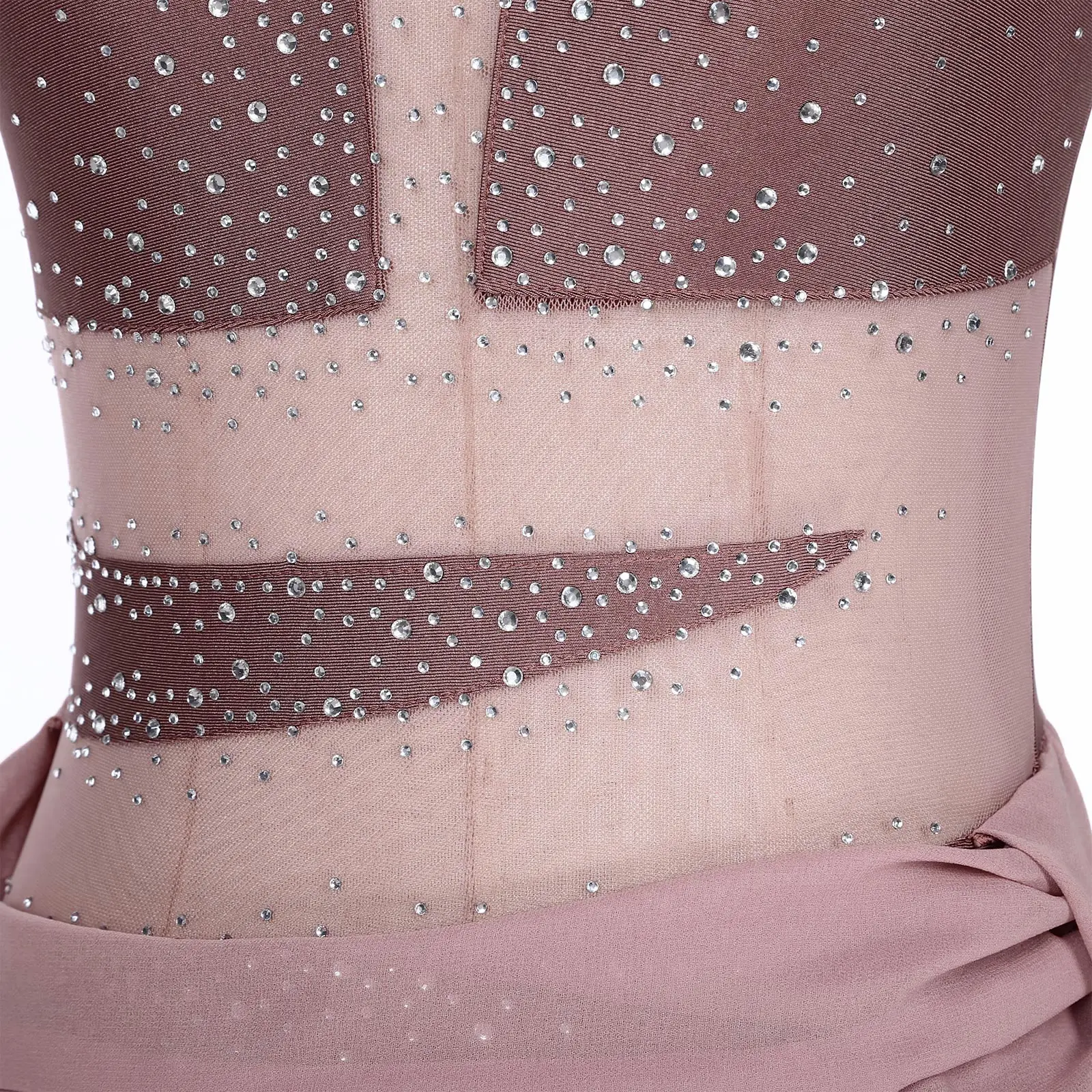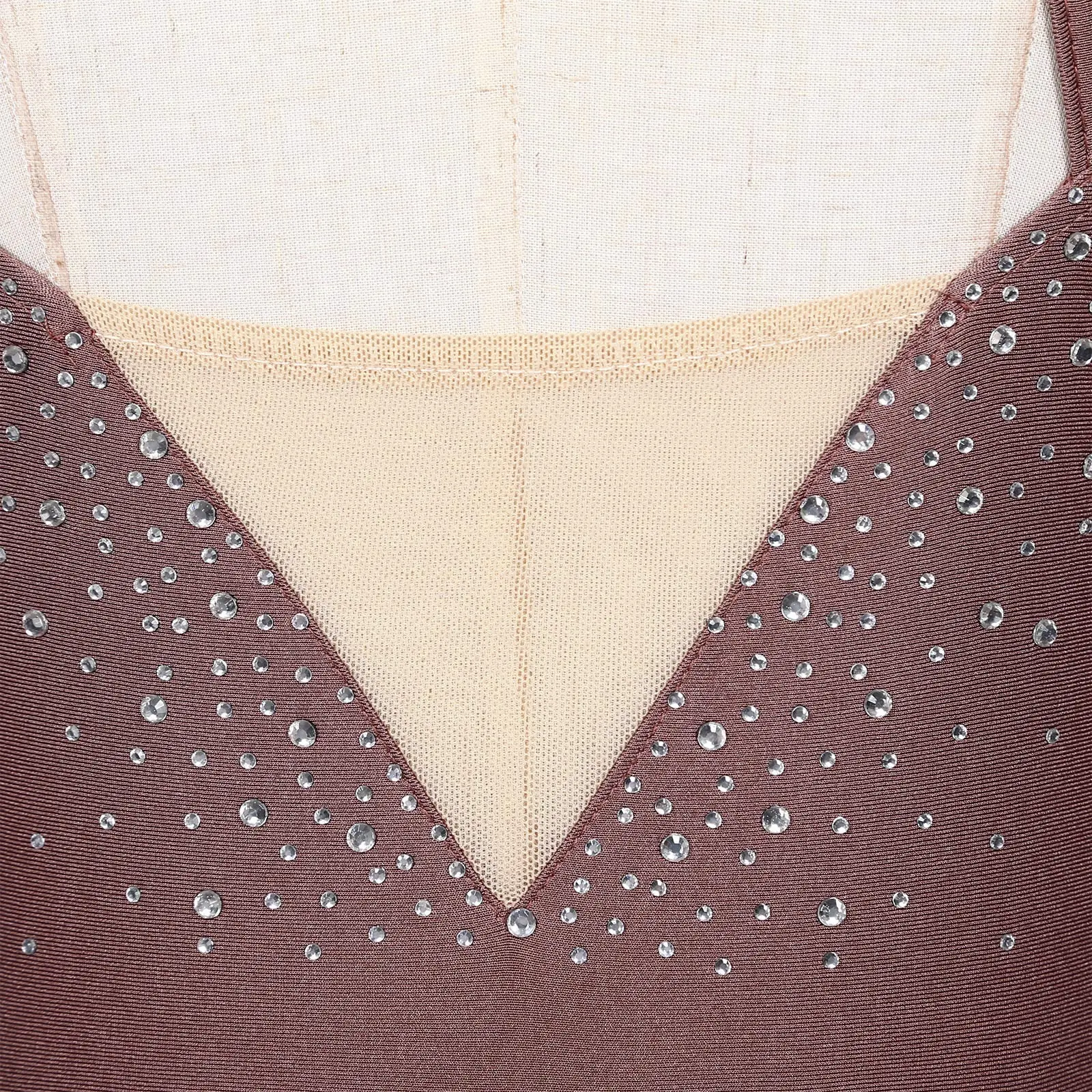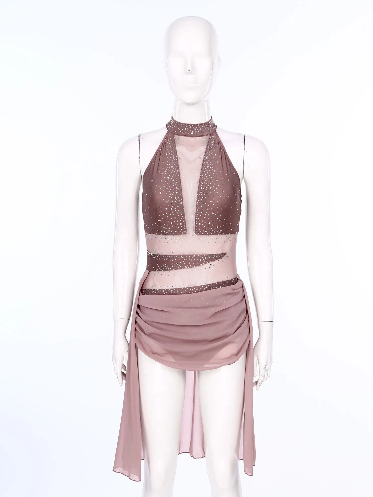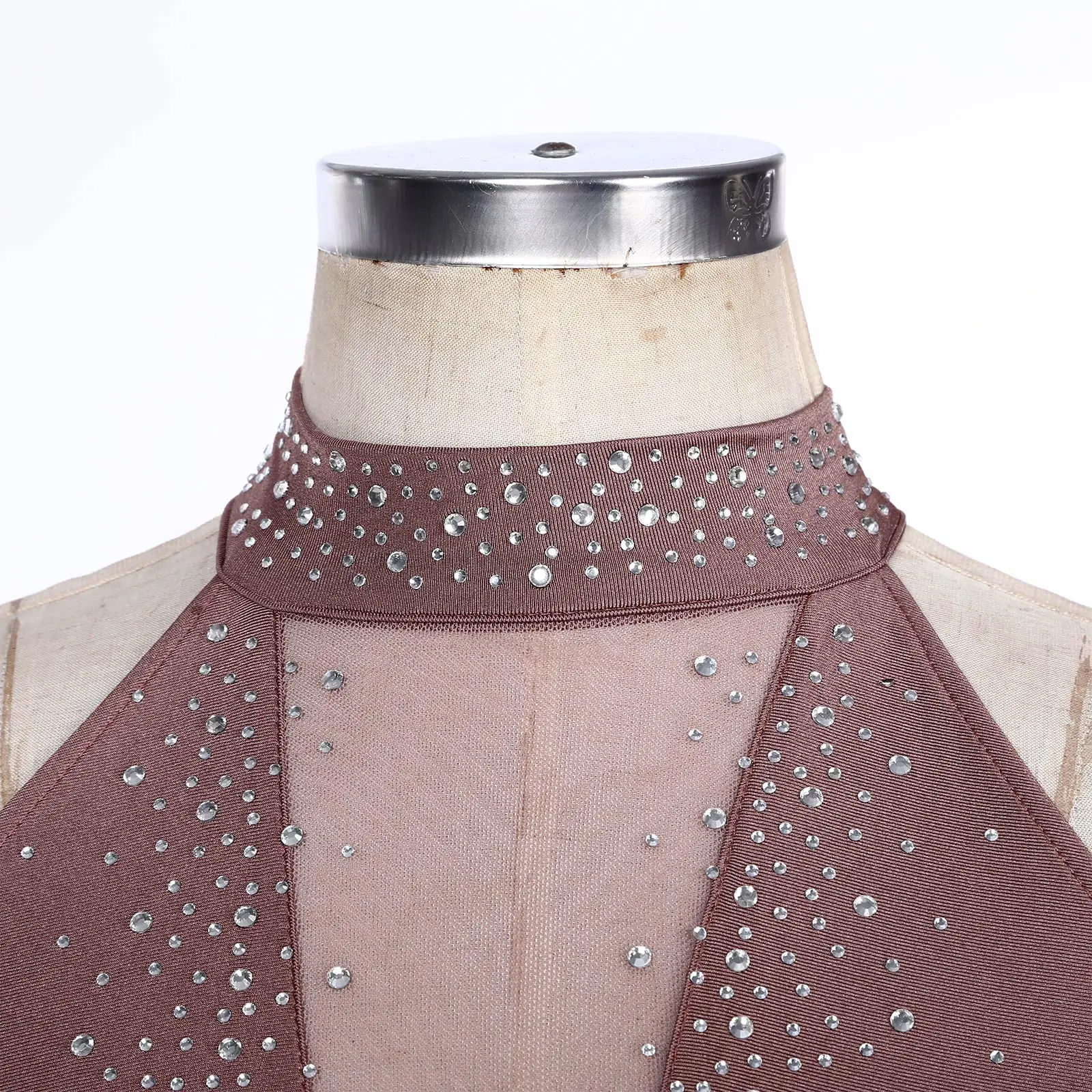 Women’s sleeveless dance dress with rhinestones that sparkle under the light to brighten up any performance.