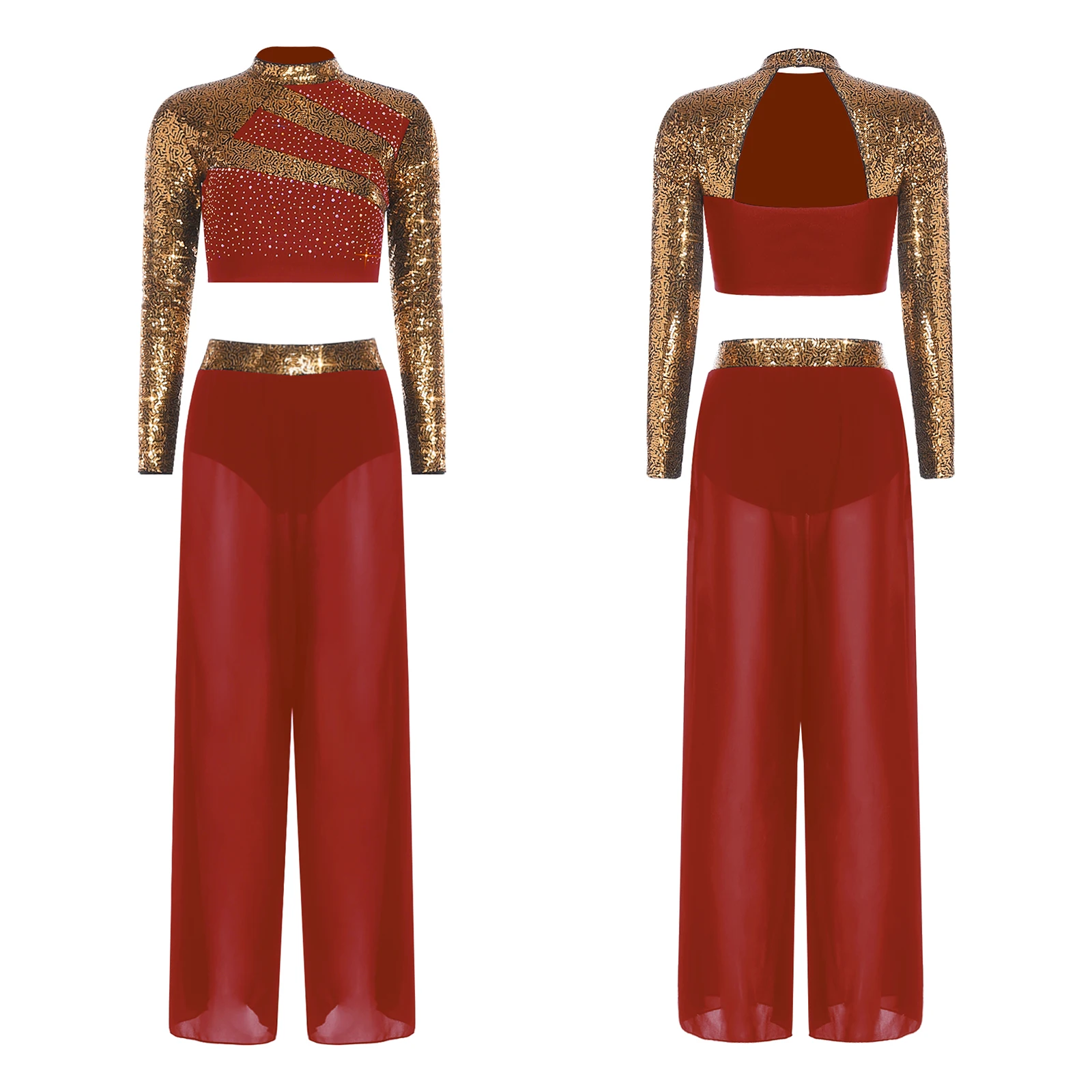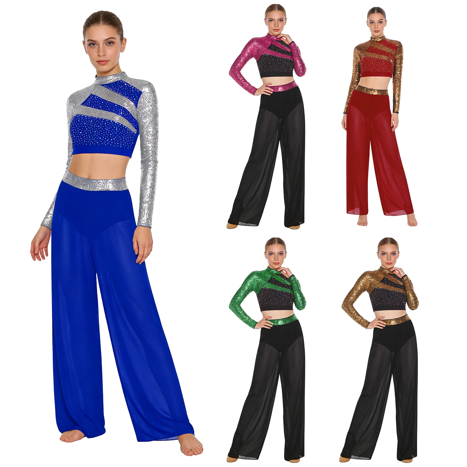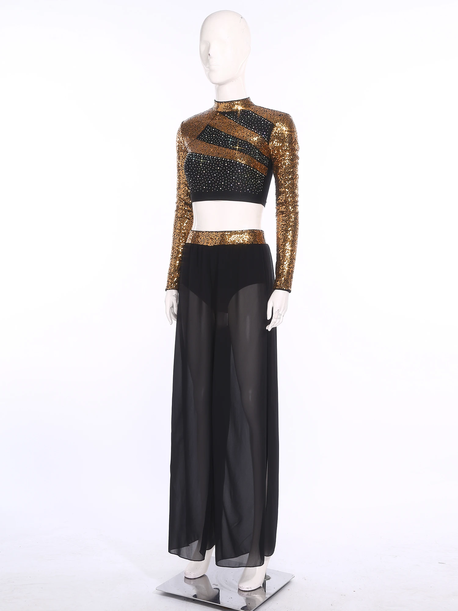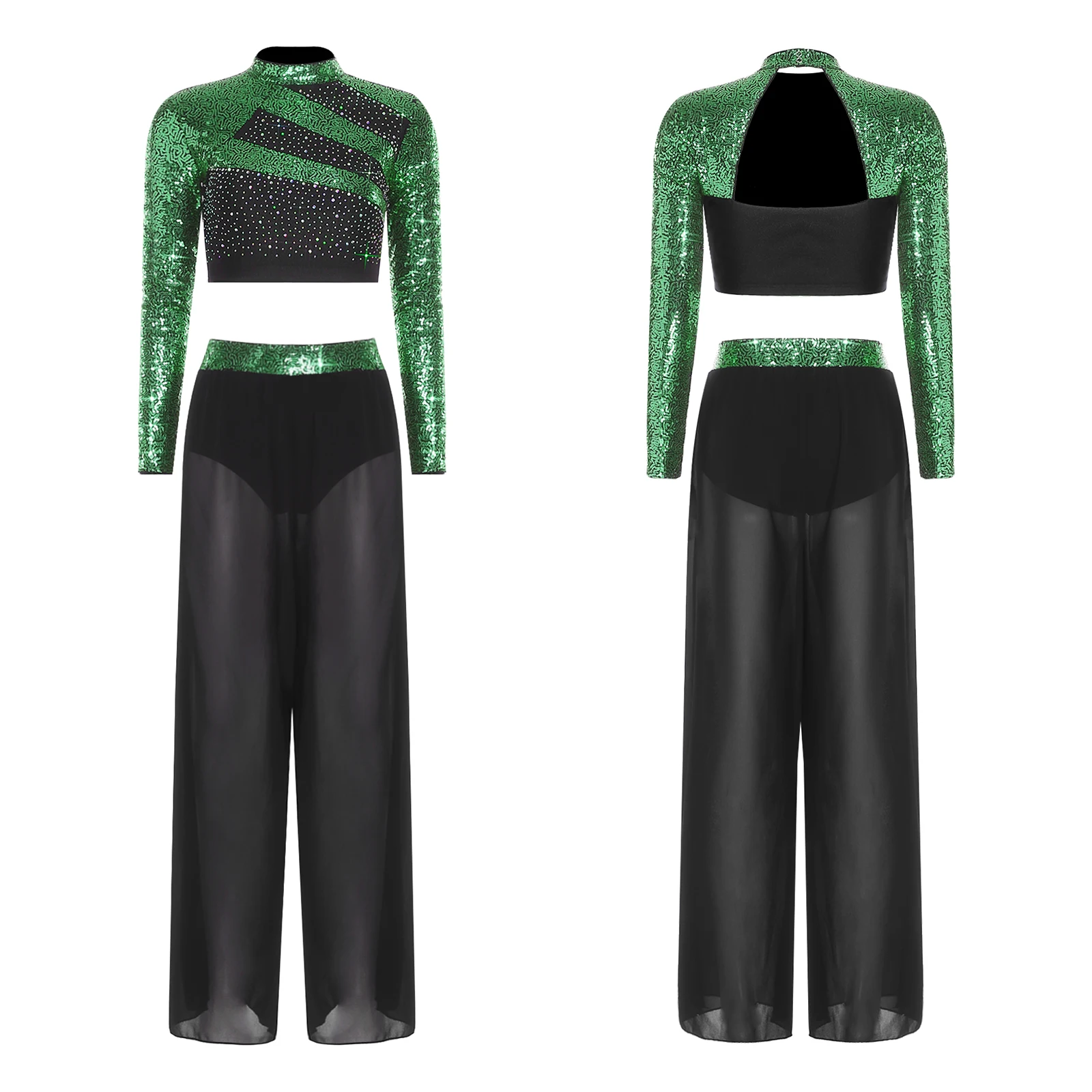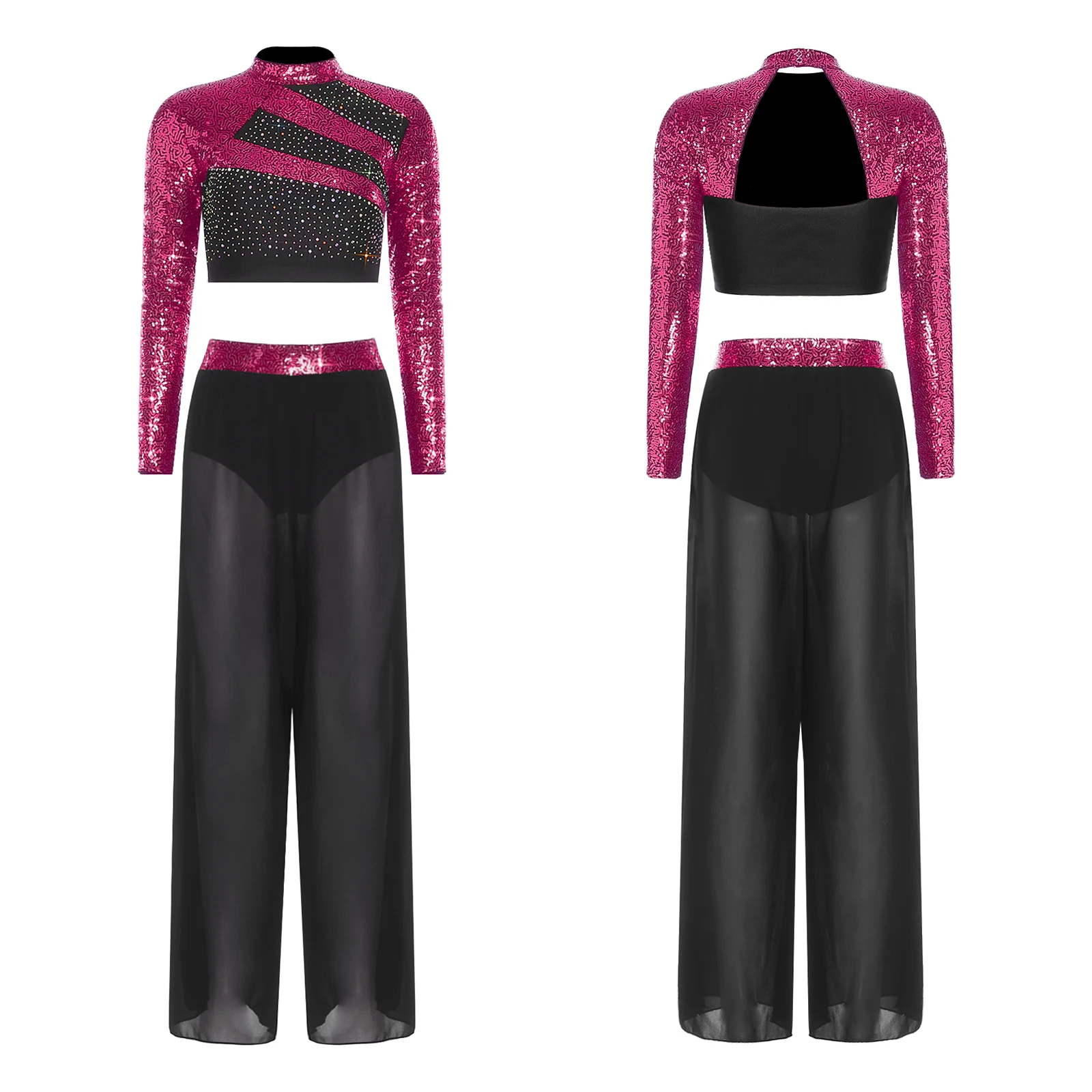 #S-XXL Women Two-Piece Lyrical Dance Outfit Mock Neck Long Sleeve Cutout Back Sequins Rhinestones Crop Top with Side Split Sheer Chiffon Pants