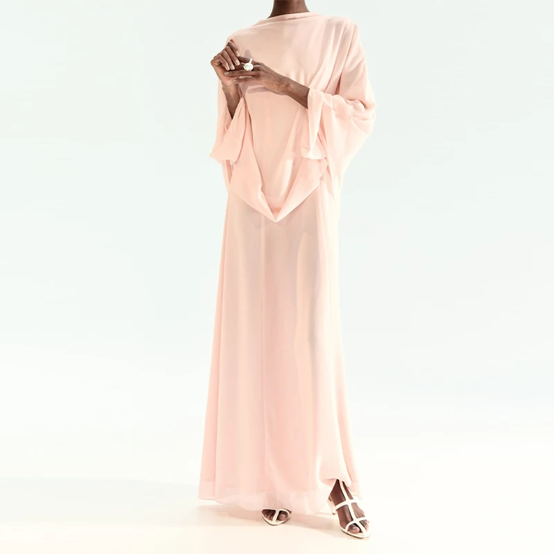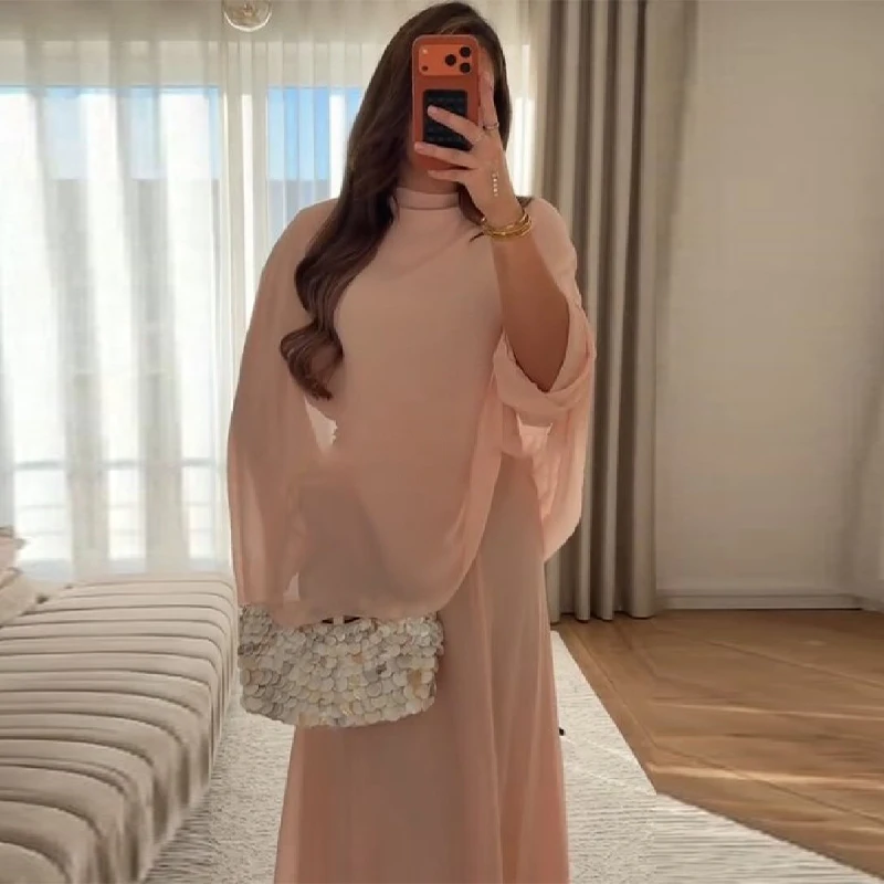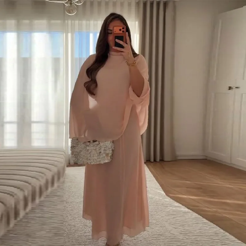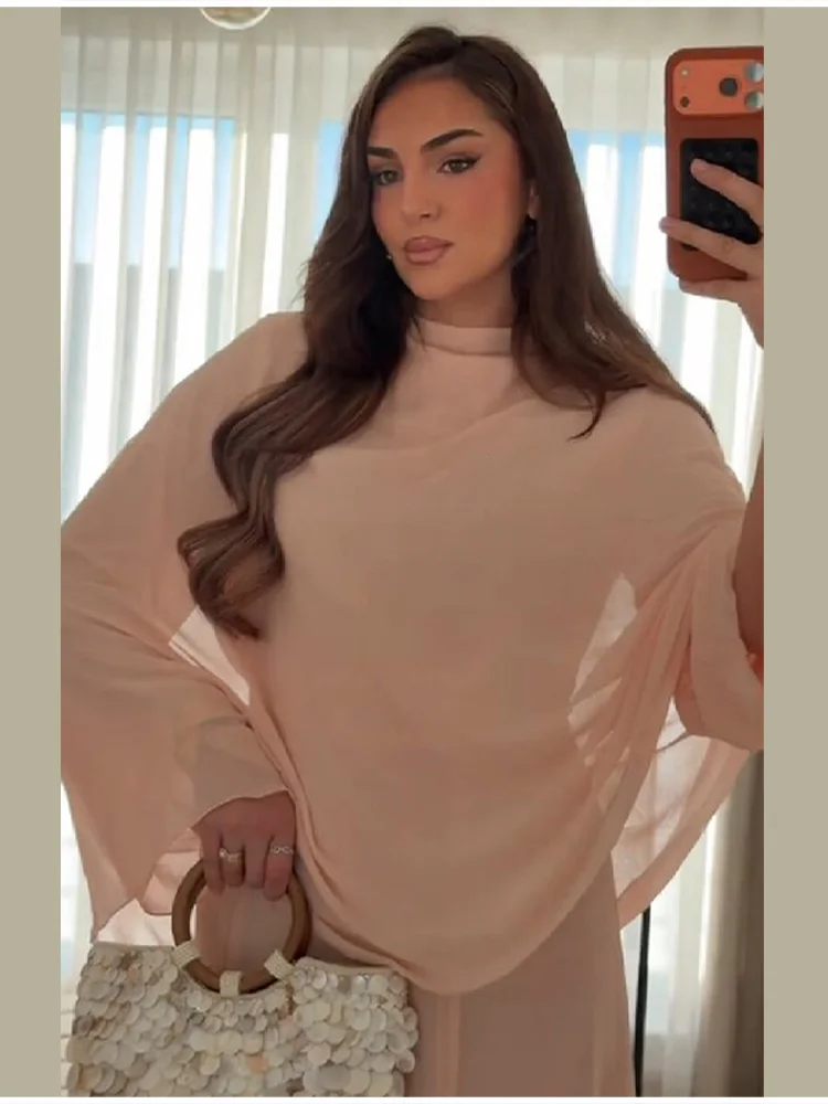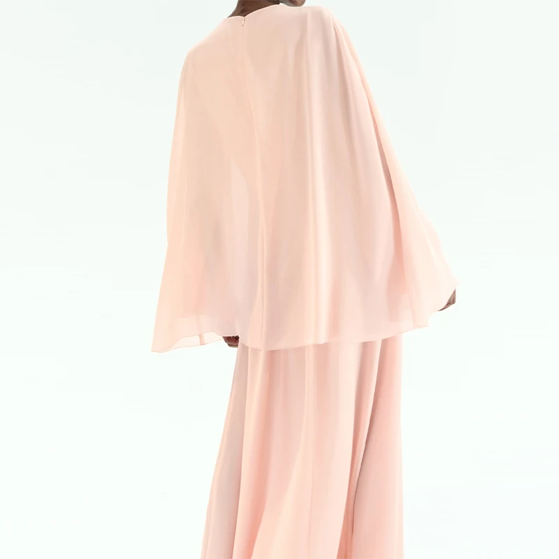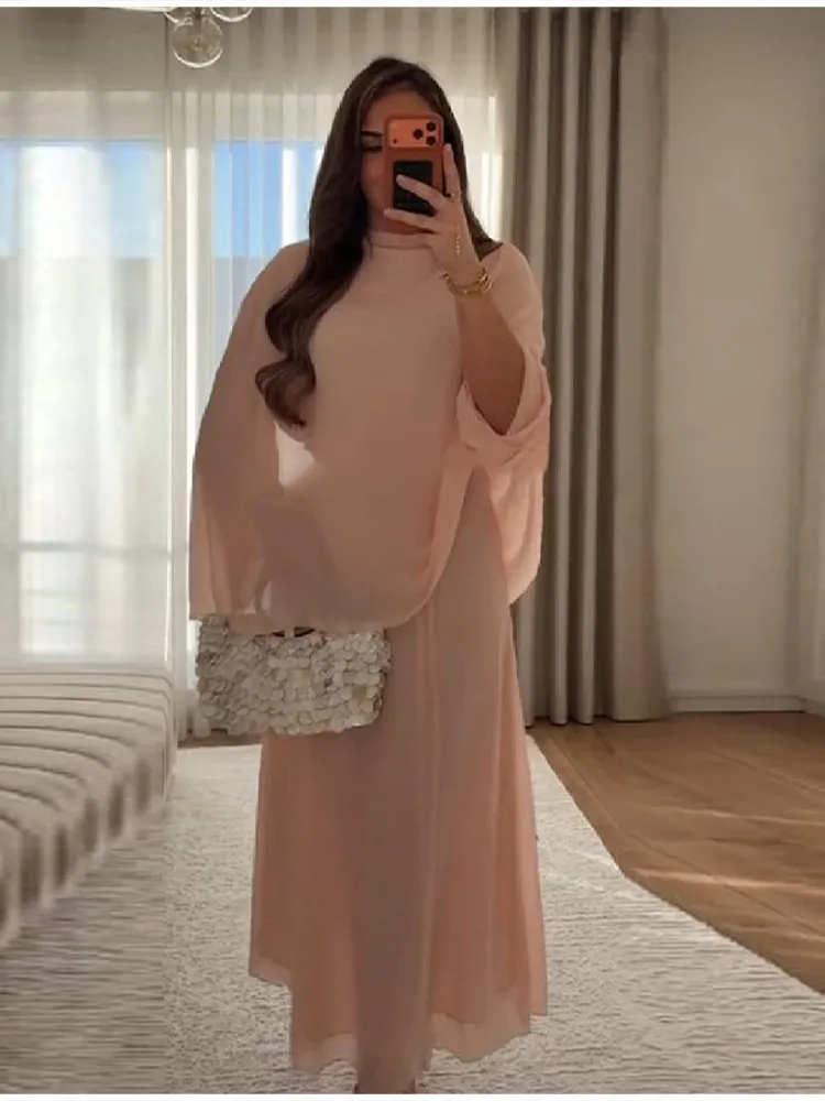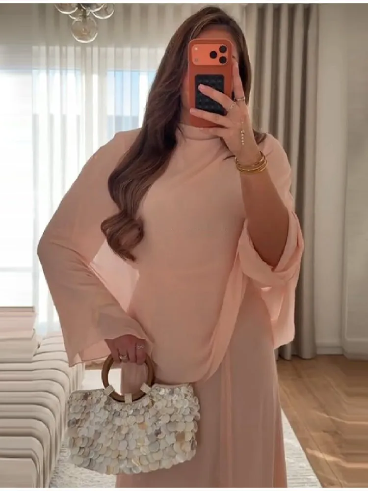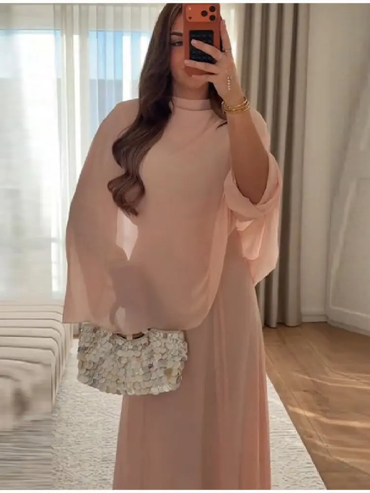 🥰 I’m absolutely obsessed with this pink dress! The soft nude-pink shade is so flattering on my skin tone, and the fabric is incredibly light and flowy—the high neck adds an elegant touch