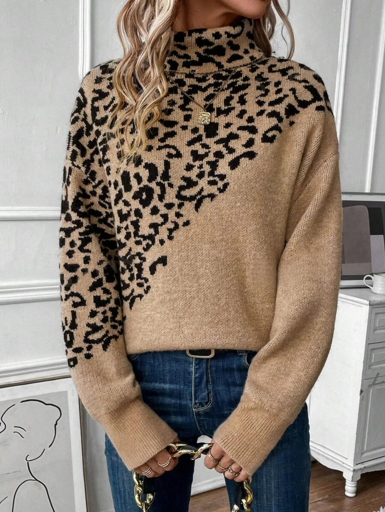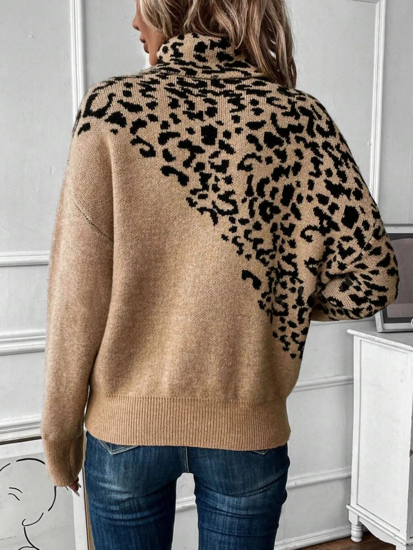 Featuring an asymmetric leopard print, this turtleneck jumper adds a touch of wild elegance to any outfit.