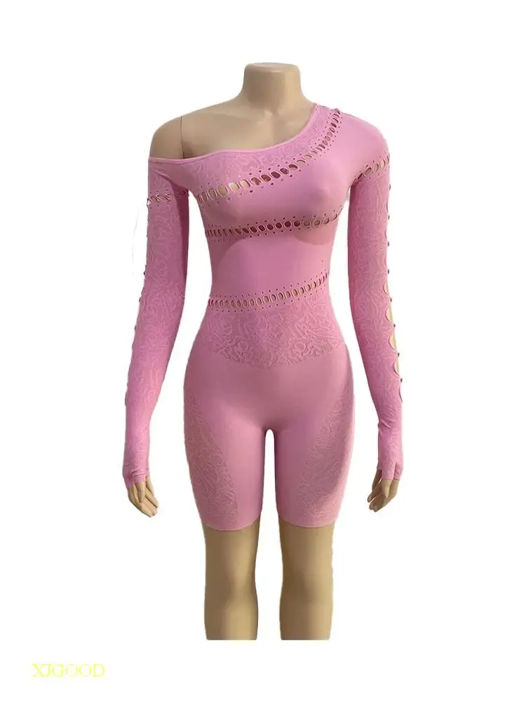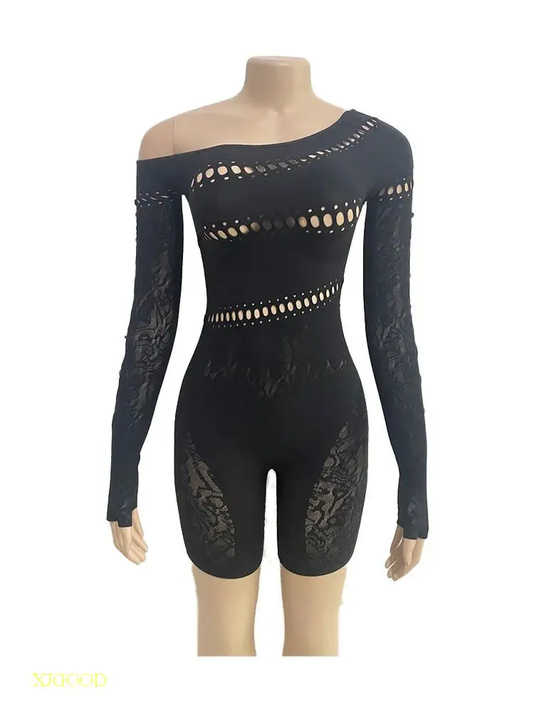 This jumpsuit features a slanted shoulder and lace patchwork design, offering a unique and stylish look.