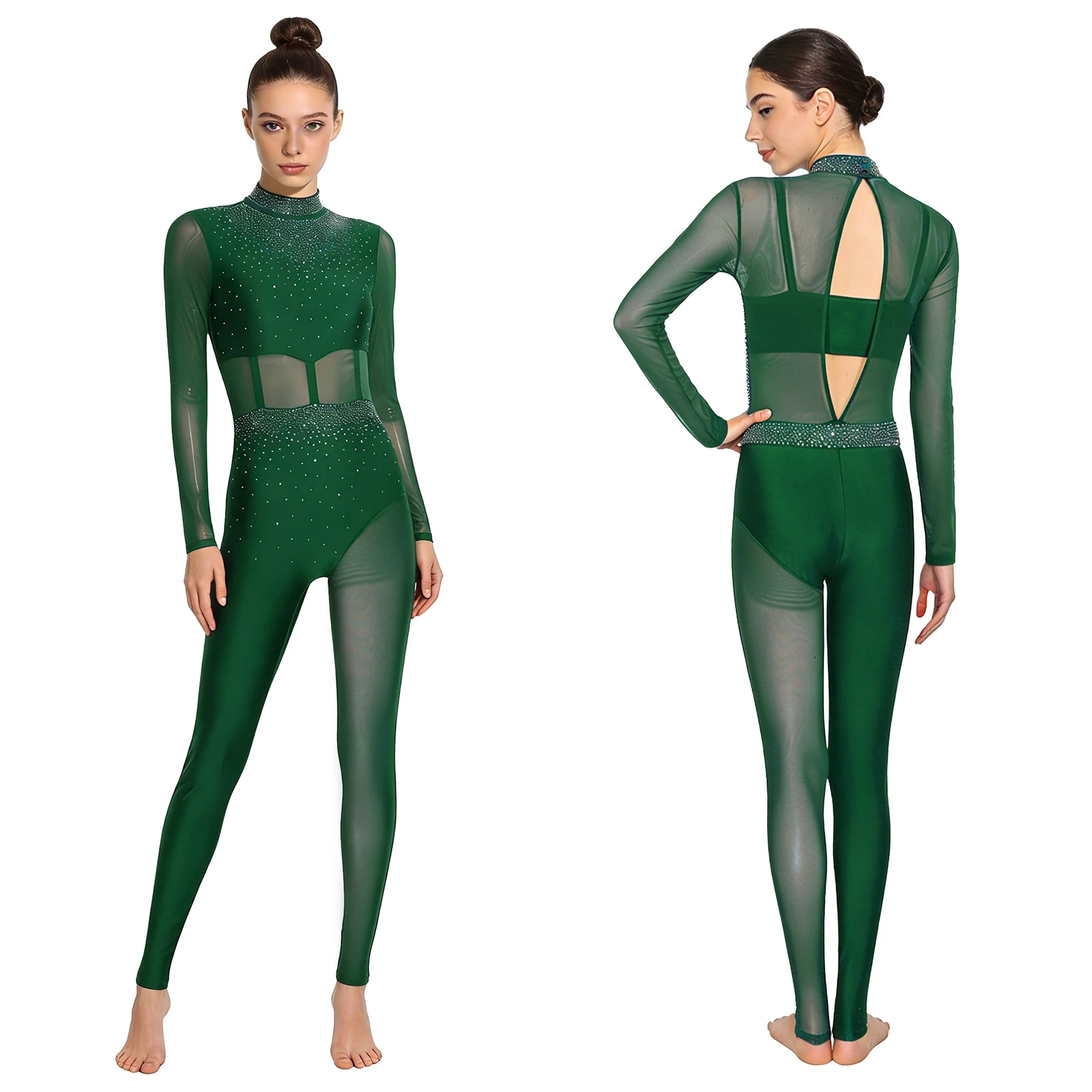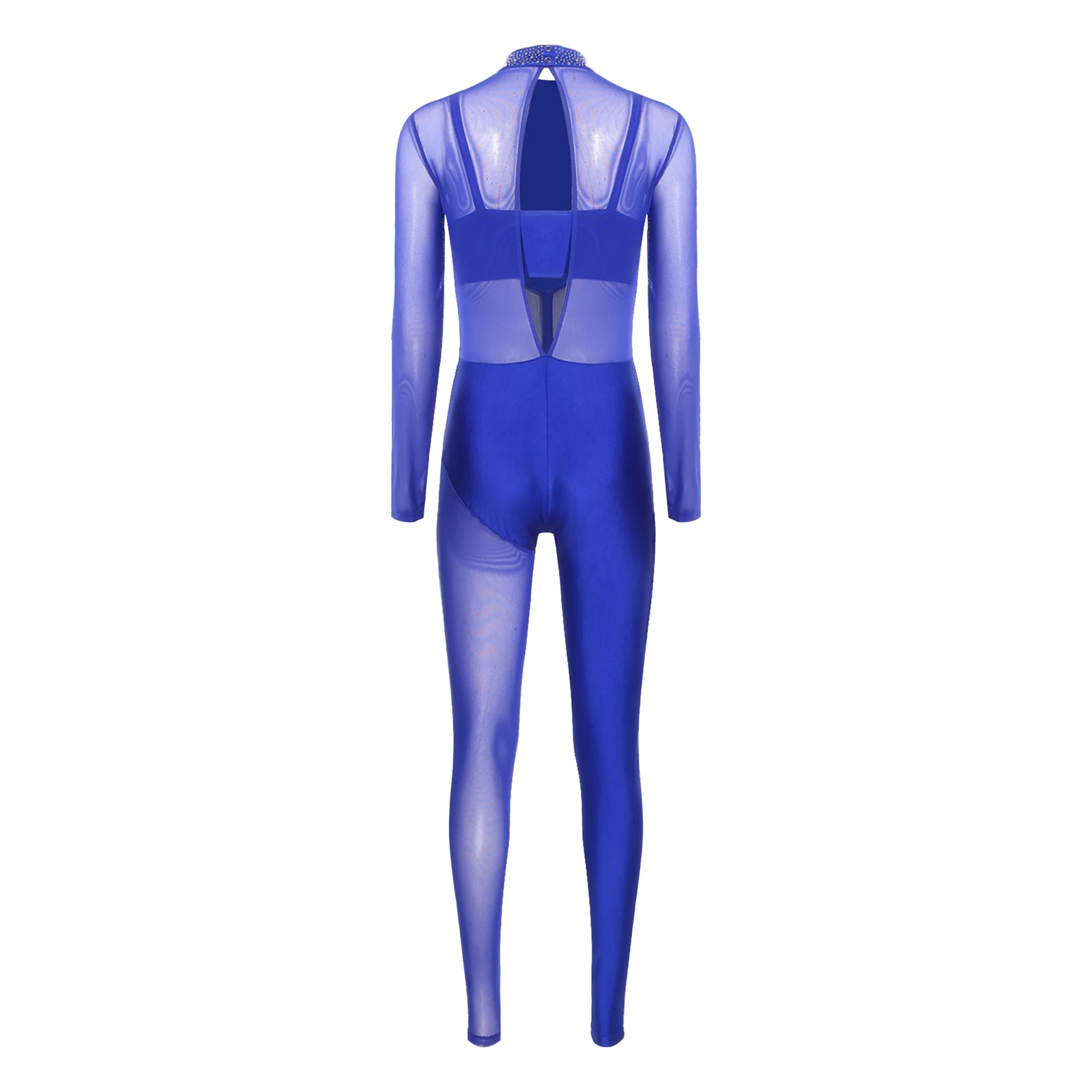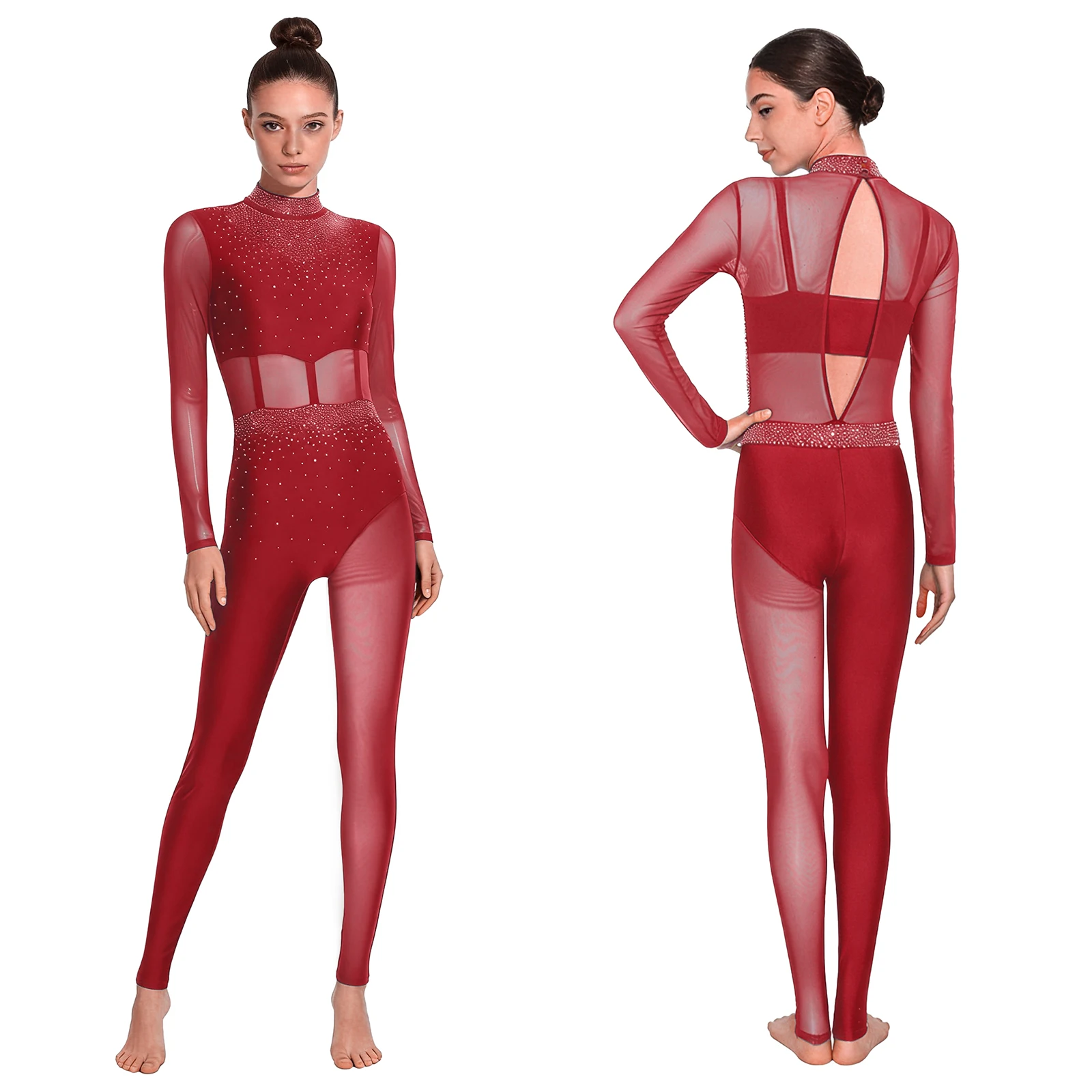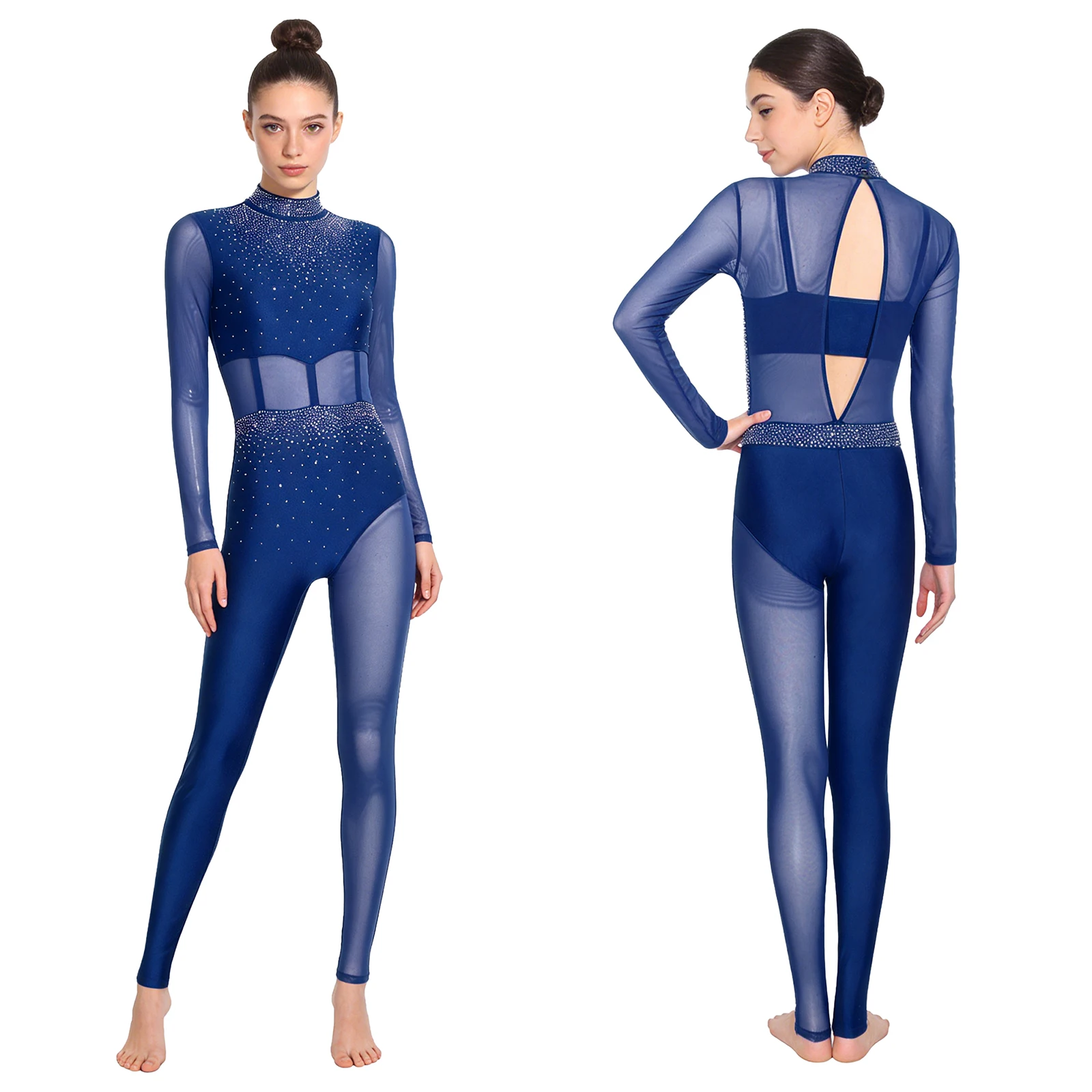 #S-XXL Womens Gymnastics Unitard Bodysuit Rhinestone Sheer Mesh Patchwork Cutout Back Full-body Jumpsuit for Figure Skating Performance
