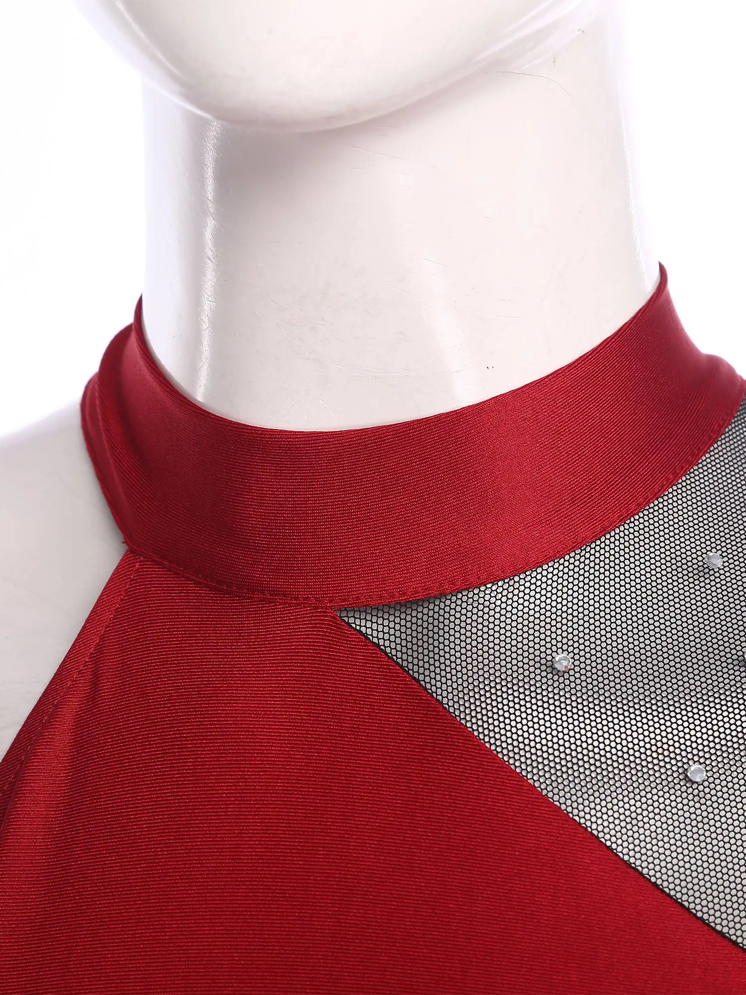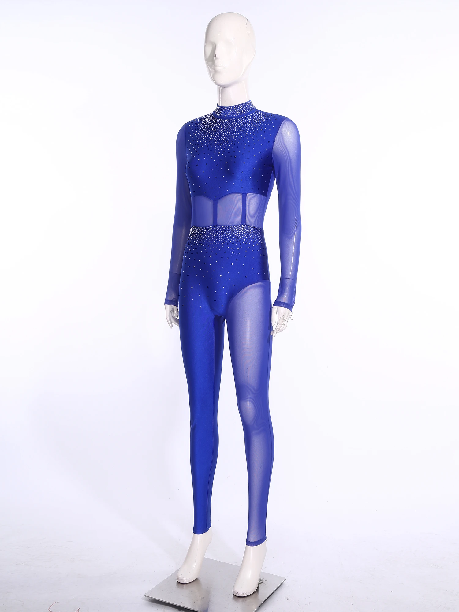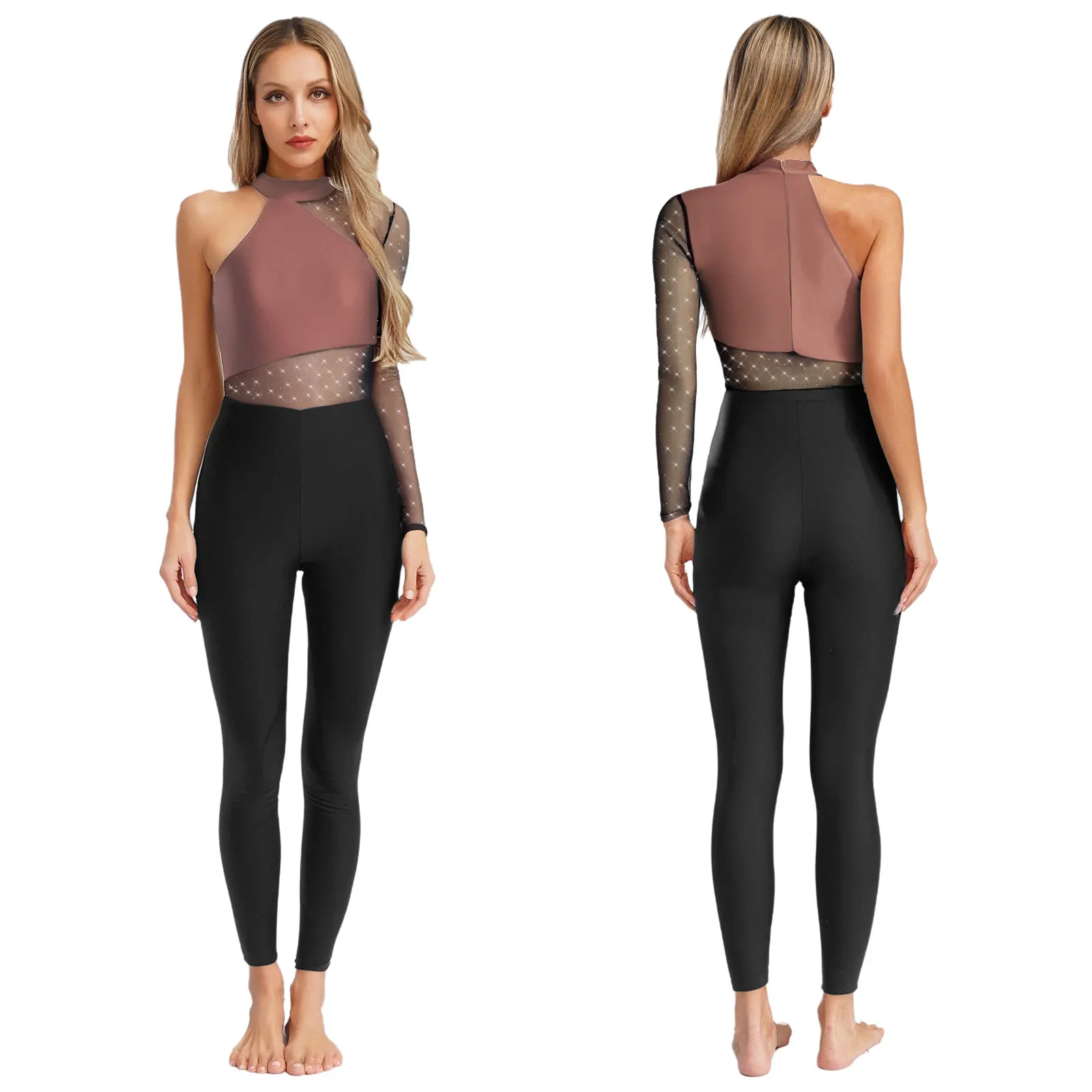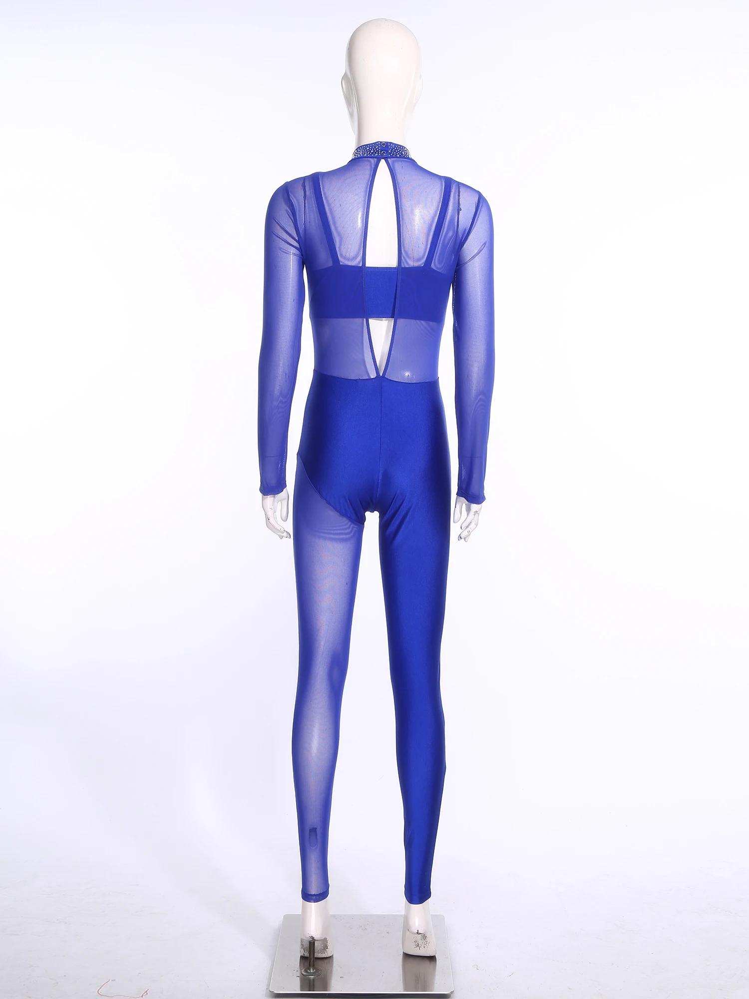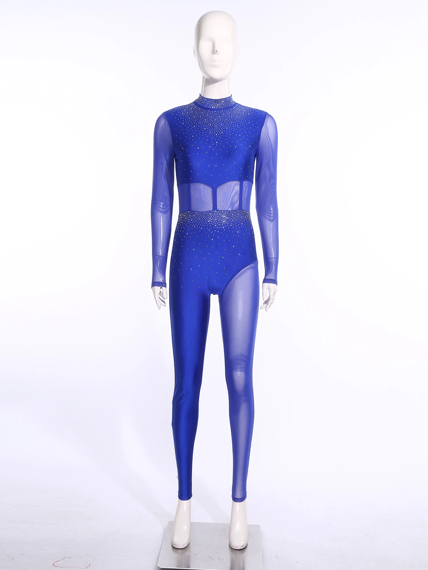 #S-XXL Womens Gymnastics Unitard Bodysuit Rhinestone Sheer Mesh Patchwork Cutout Back Full-body Jumpsuit for Figure Skating Performance