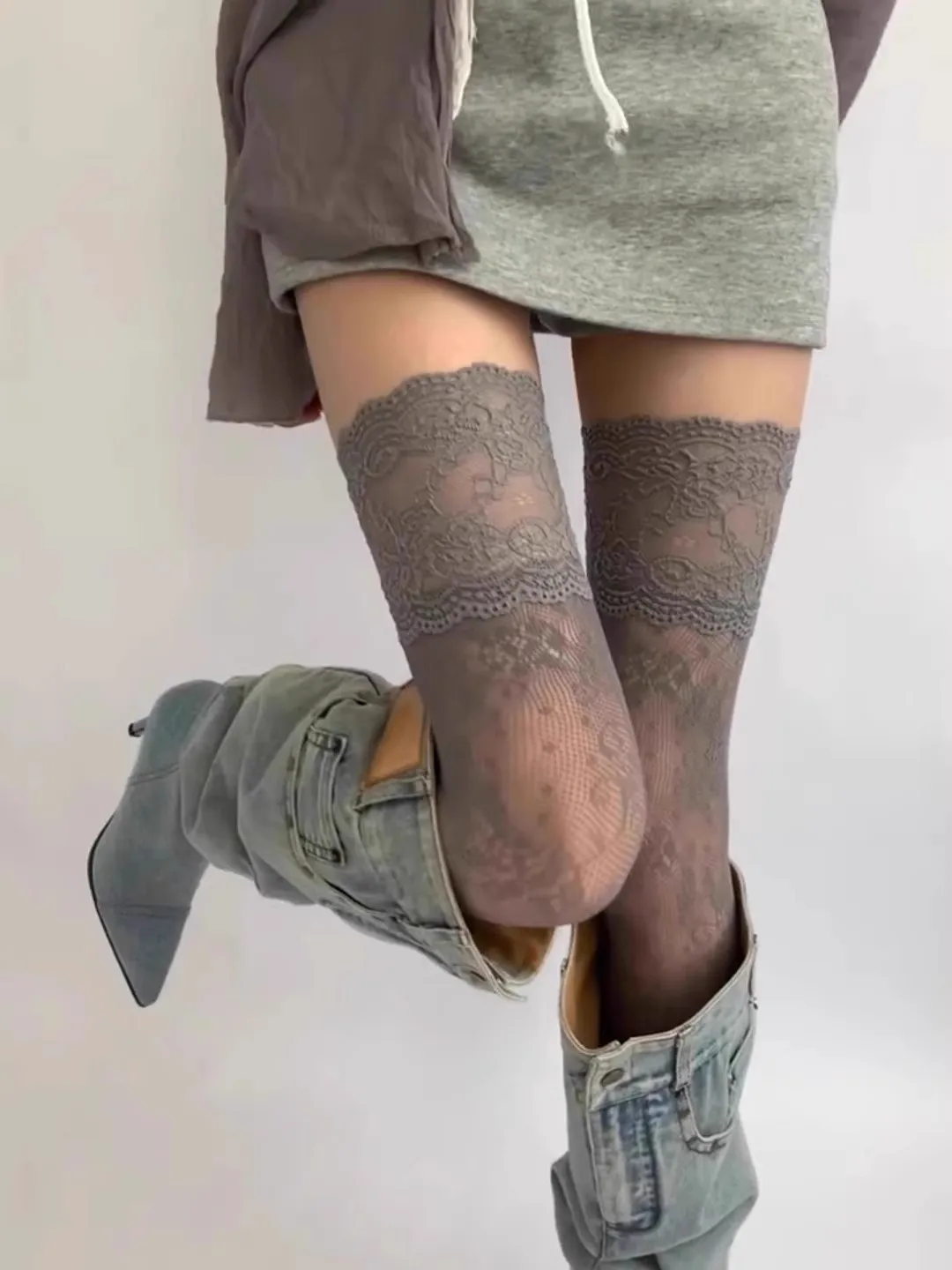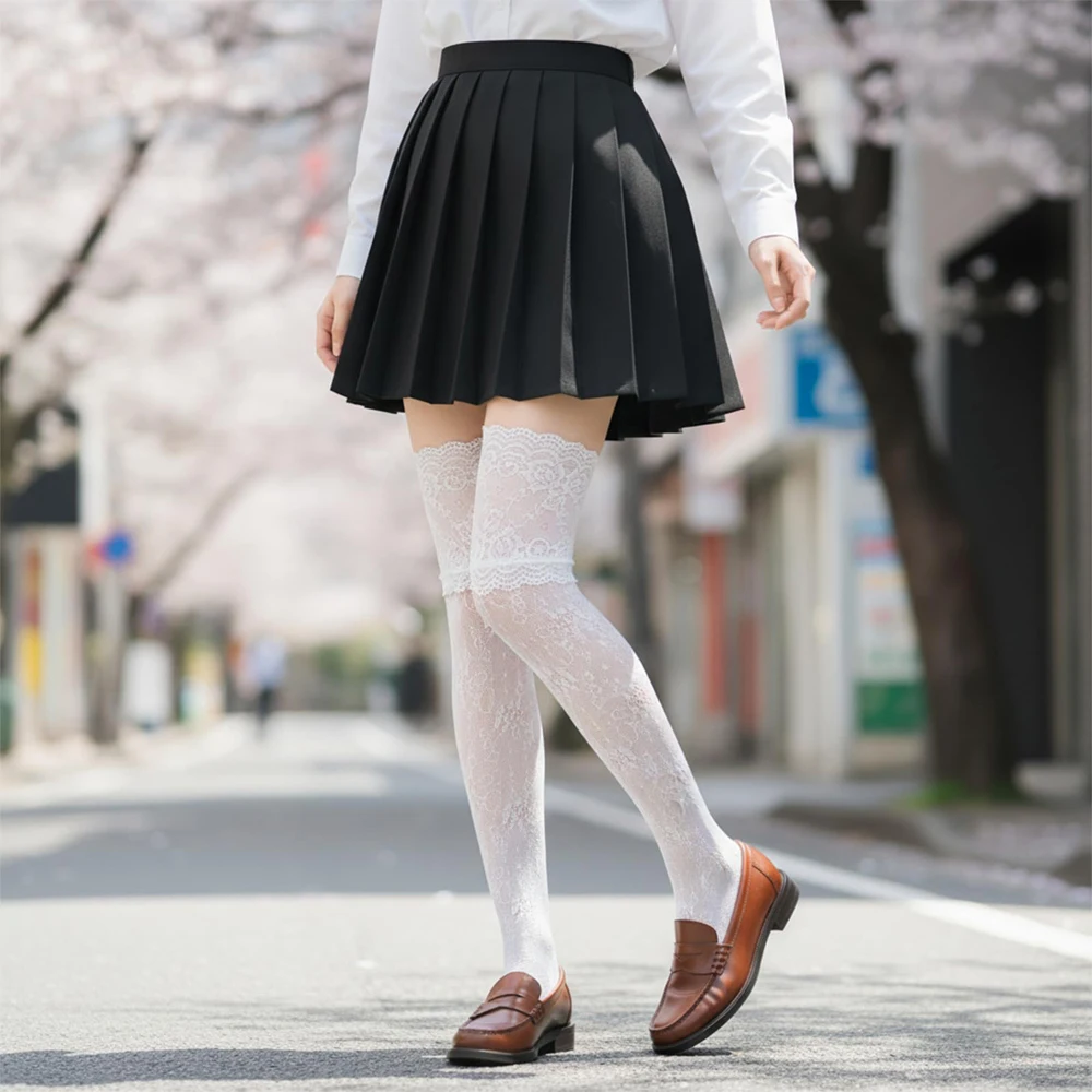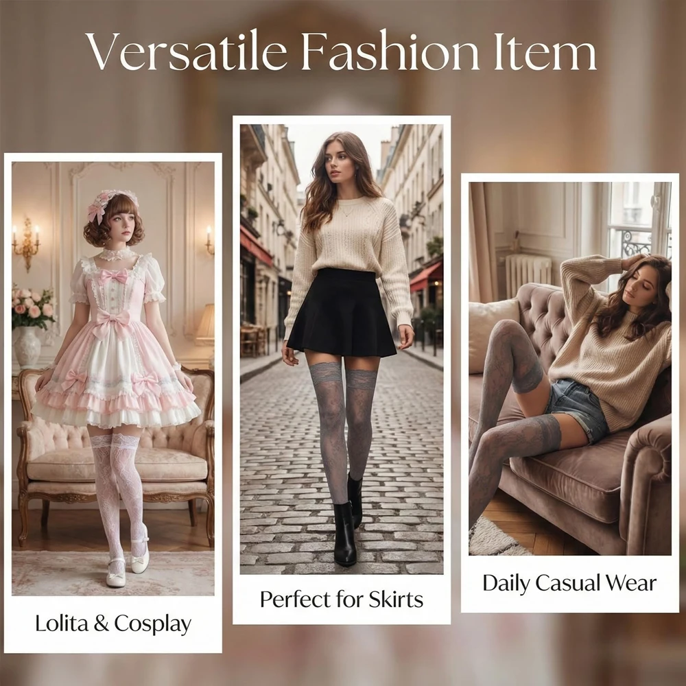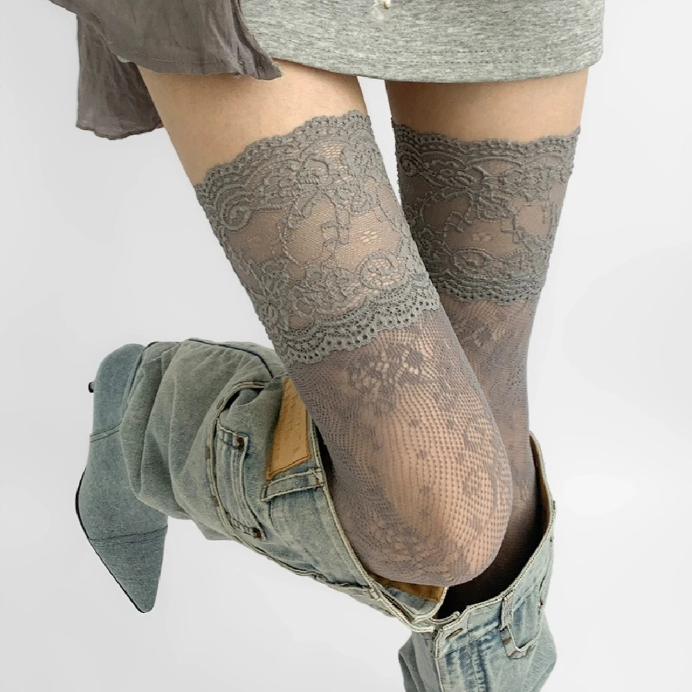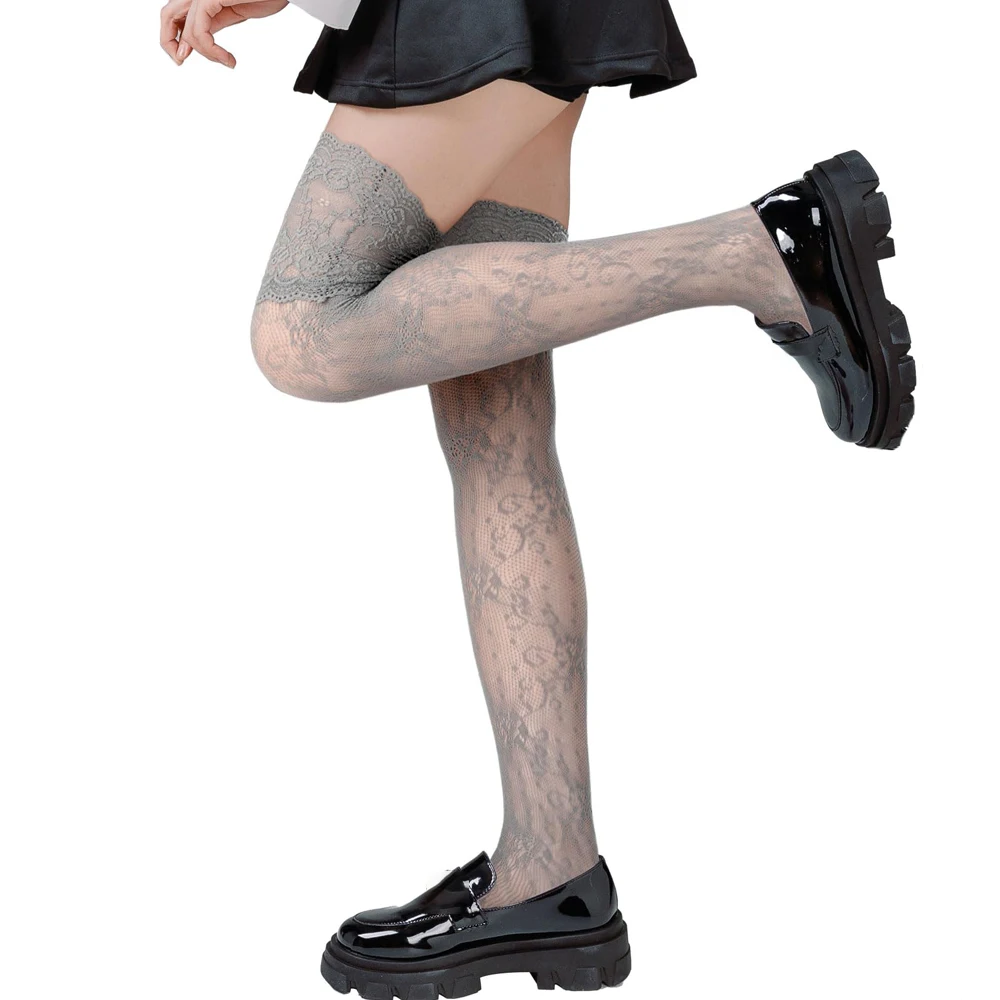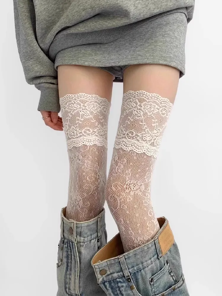Women's Sexy Lace Trim Nylon Fishnet Stockings Retro Floral Sweet Mesh Breathable Thigh High Long Socks JK Over The Knee Socks