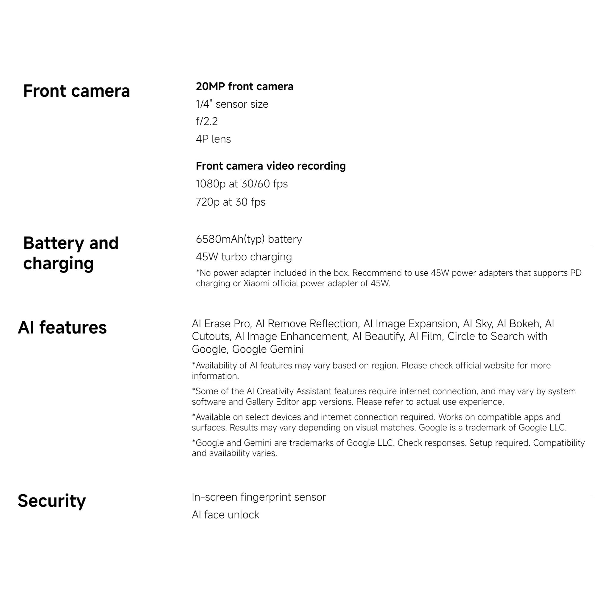 - Front Camera Pixel: 20 MP