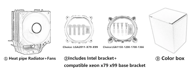 Package: Color Box (CPU cooler*1, Includes 1 set of Intel base bracket and screws,Xeon-x79x99 base bracket+screws * 1 set, silicone grease*2 )