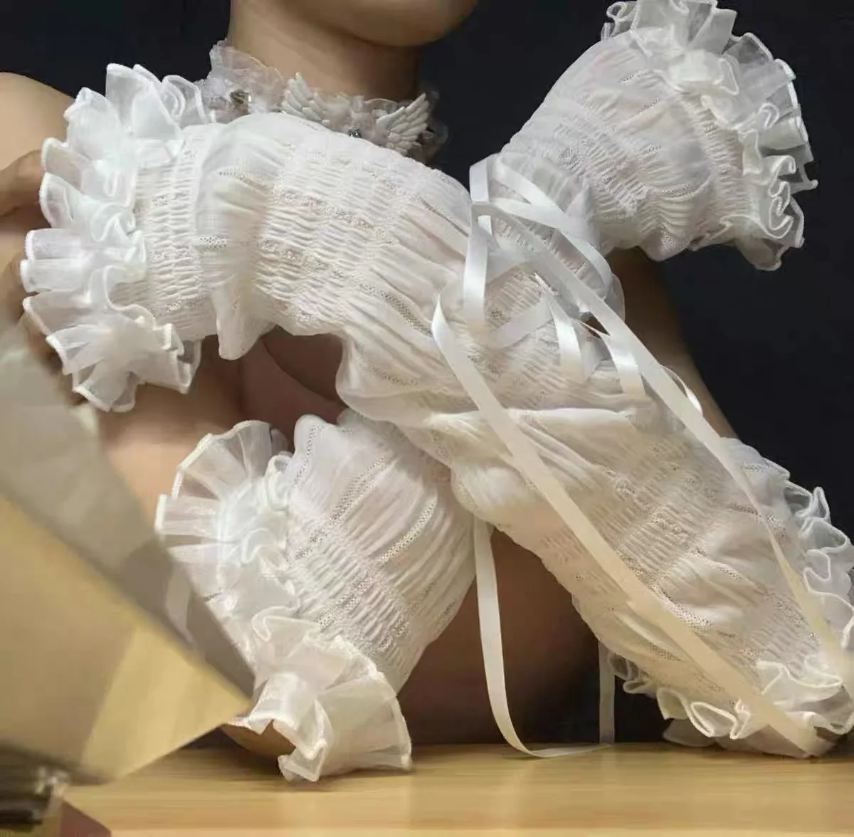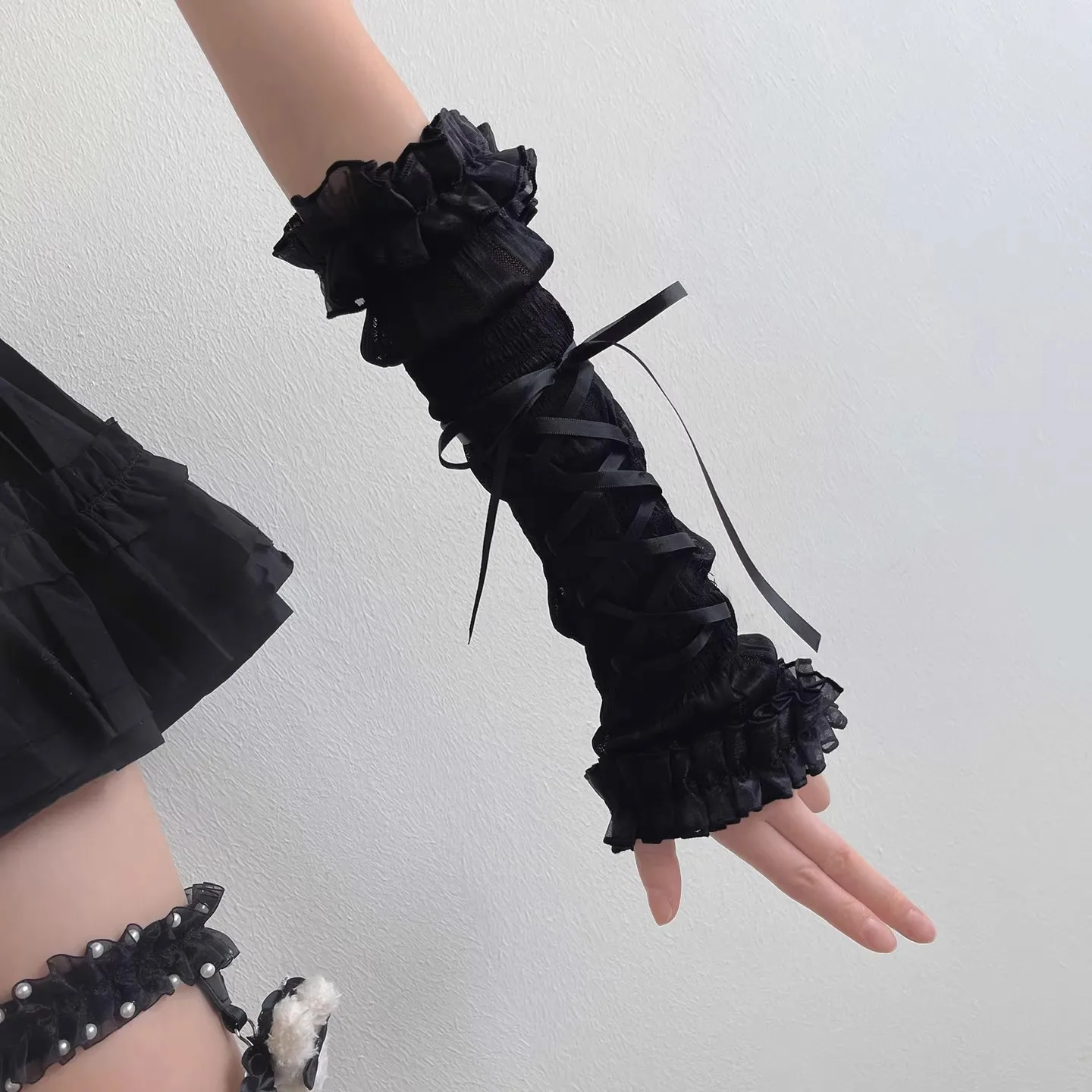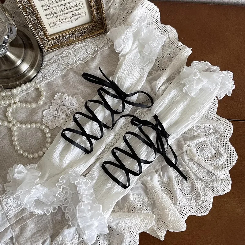 Y2K Harajuku Ballet Bow Tie Long Cuff Gloves Mesh Pleated Lace Sleeves Sweet Lolita JK Maid Style Subculture Fashion Accessory