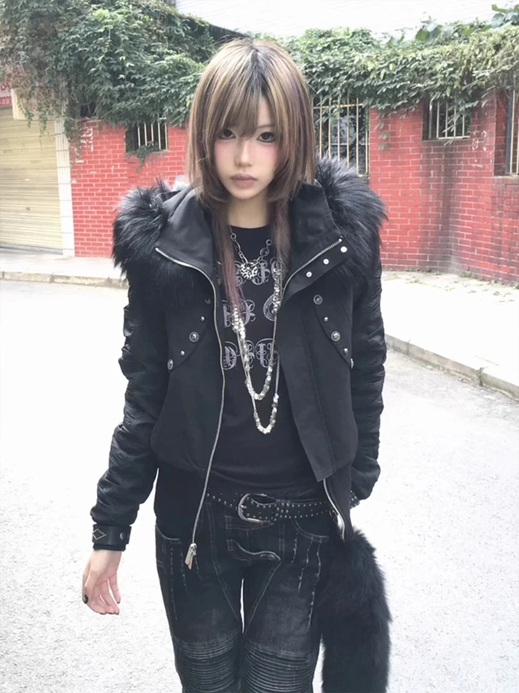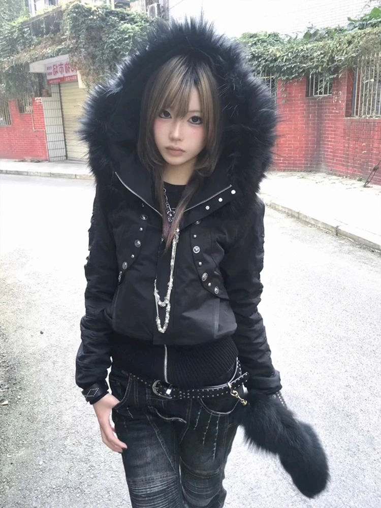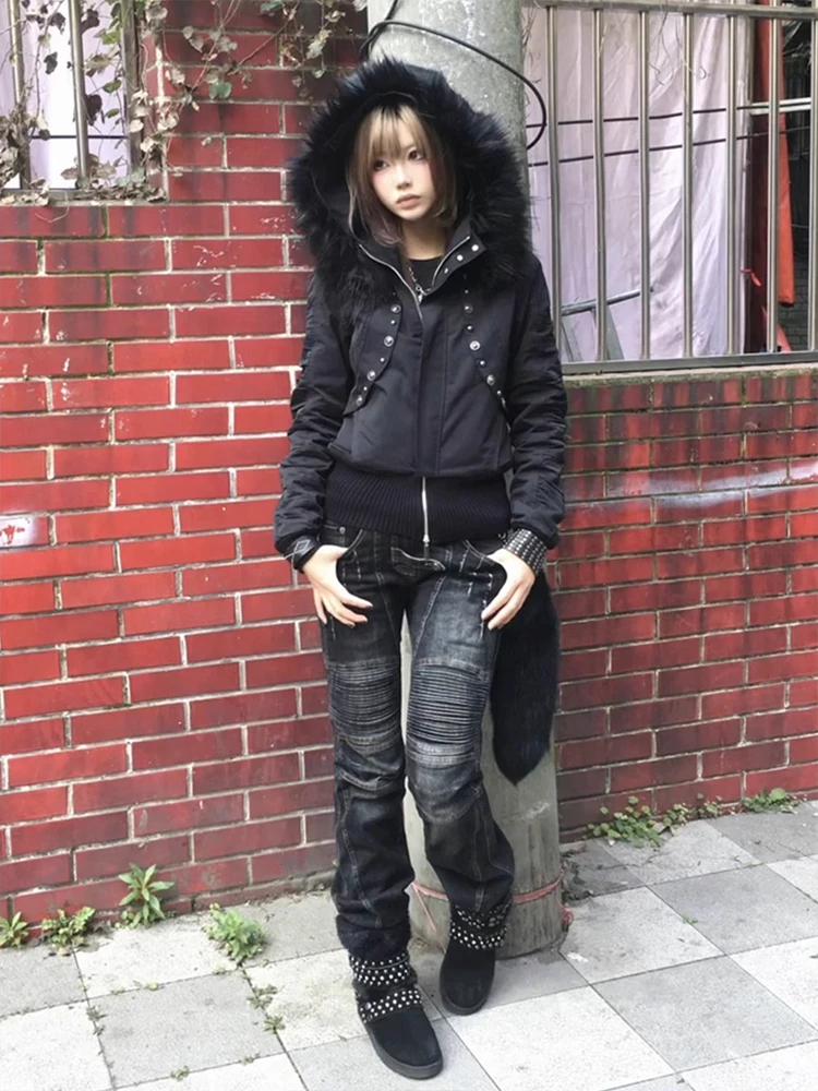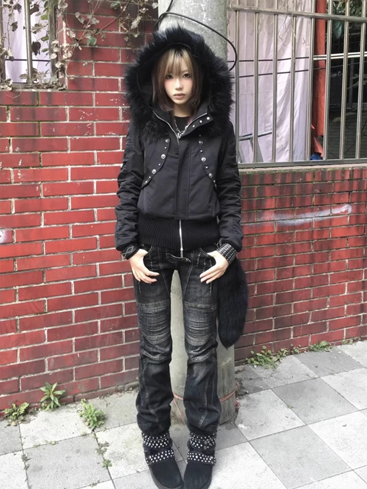 This y2k-style black hooded parka is designed for winter wear, offering thick insulation to keep you warm during the cold months.