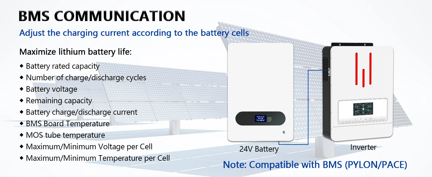 The inverter can access key battery information (e.g. voltage, current, temperature, SOC, SOH) provided by the BMS. This helps avoid dangerous situations such as overcharging, overdischarging, overcurrent and overheating. When the BMS detects an abnormality (e.g., high battery temperature), it can send a signal to the inverter to trigger the system protection mechanism to quickly stop charging and discharging and prevent the fault from expanding.(BMS only compatible with PYLON/PACE)