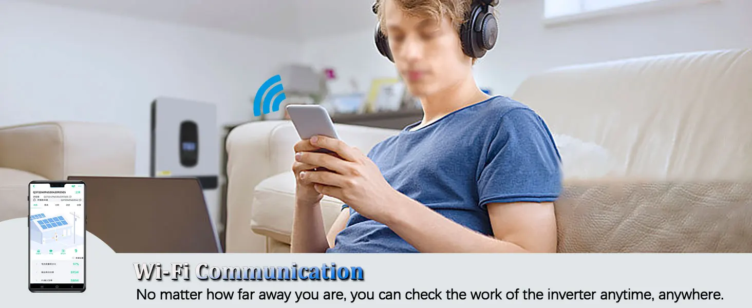 LCD display designand 3 LED indicators for dynamic display of system data and operating status, Configurable battery charging current, AC/Solar Charger priority and Load Supply Priority via LCD setting. Support WIFI remote monitoring, users can monitor the status of the PV system from the mobile phone or from the website anytime anywhere. (Not included).