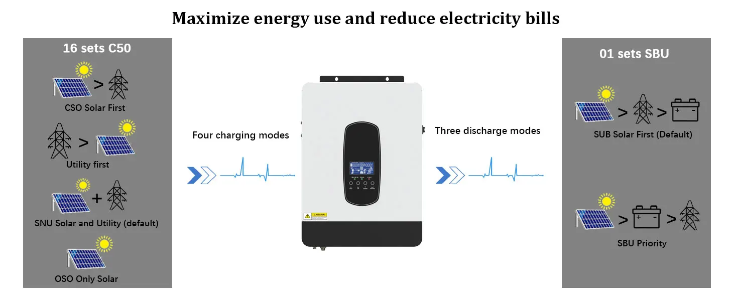 Off Grid Solar Inverter have 4 charging modes are optional, i.e. Only Solar, Mains Frist , Solar Frist and Mains & Solar hybrid charging;and 3 output modes are available, i.e. Solar Frist, Mains Frist and SBU Priority, uninterrupted power supply to meet different application requirements. And compatible to mains voltage or generator power, Auto restart while AC is recovering.