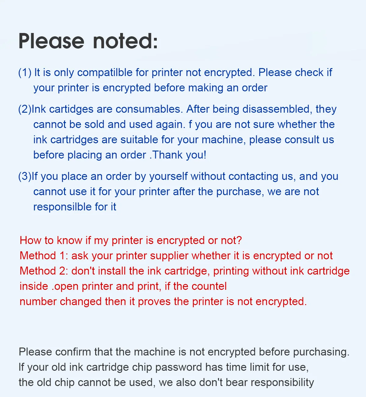 Method 2: don't install ink cartridge, print without ink inside ,open printer and print, if the counter number changed then prove no encrypted.