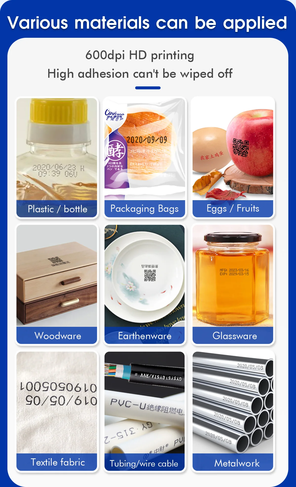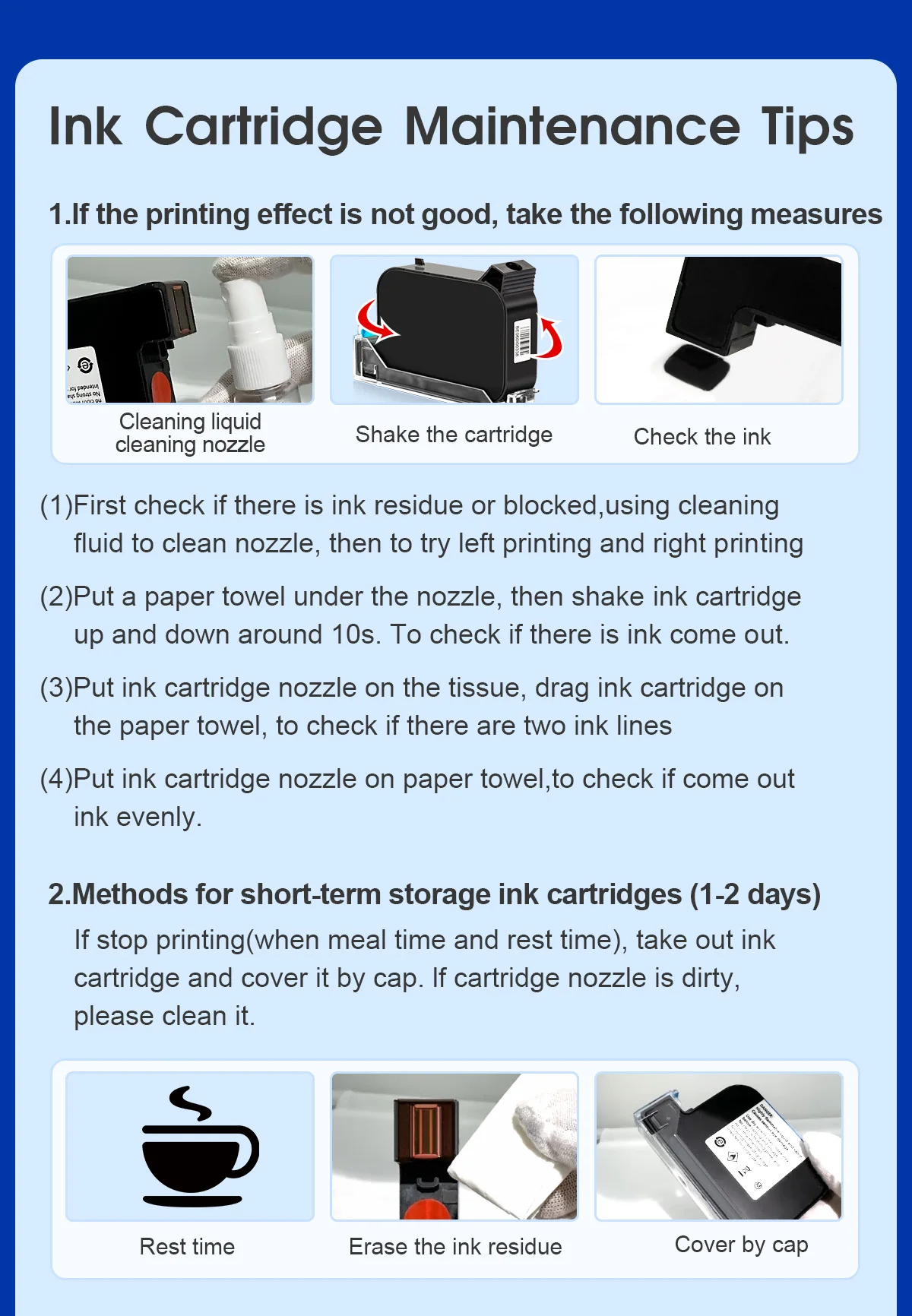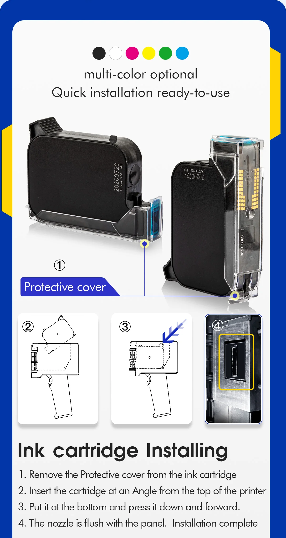 B: ink: Solvent fast drying ink, please note it's inkjet not engrave so wait ink dry