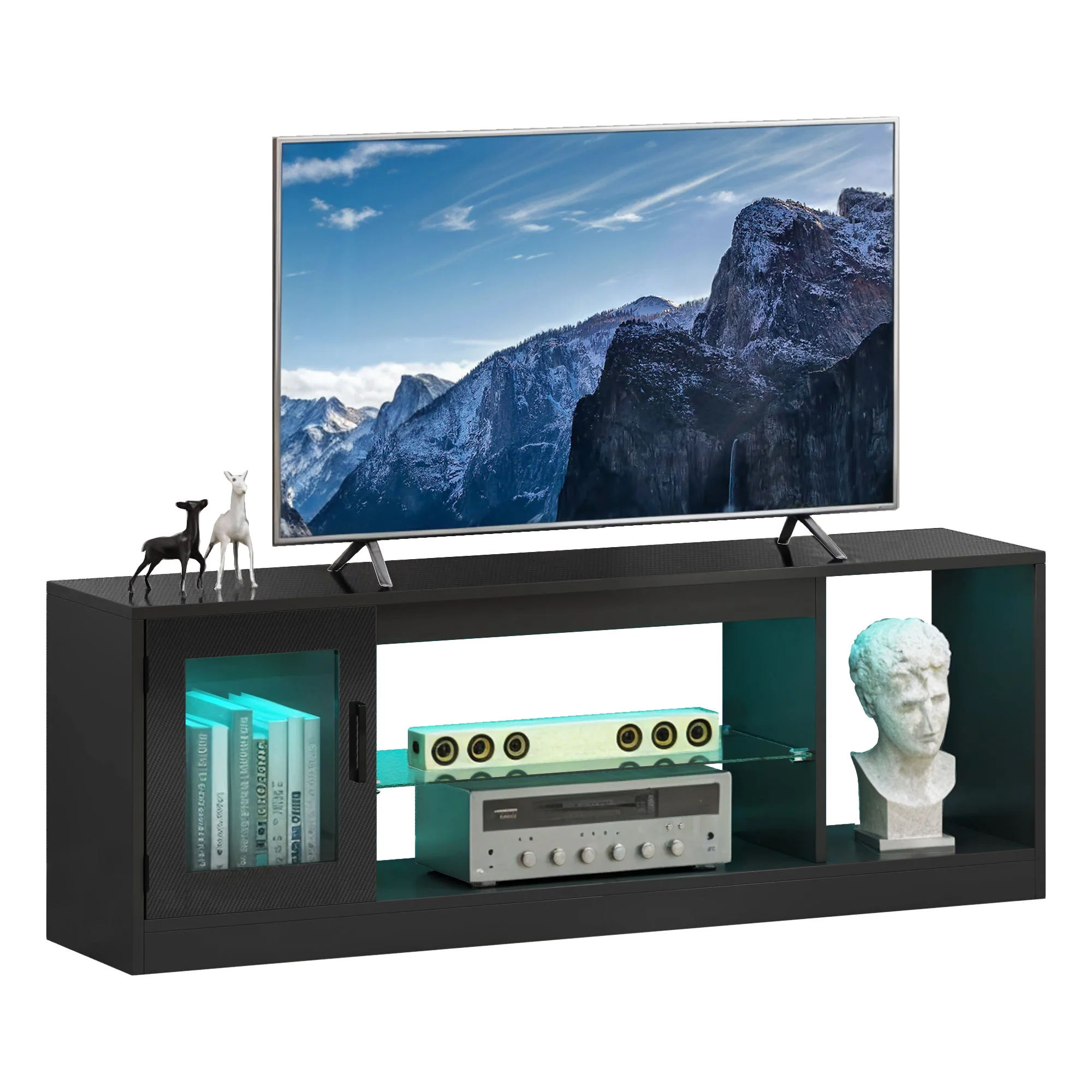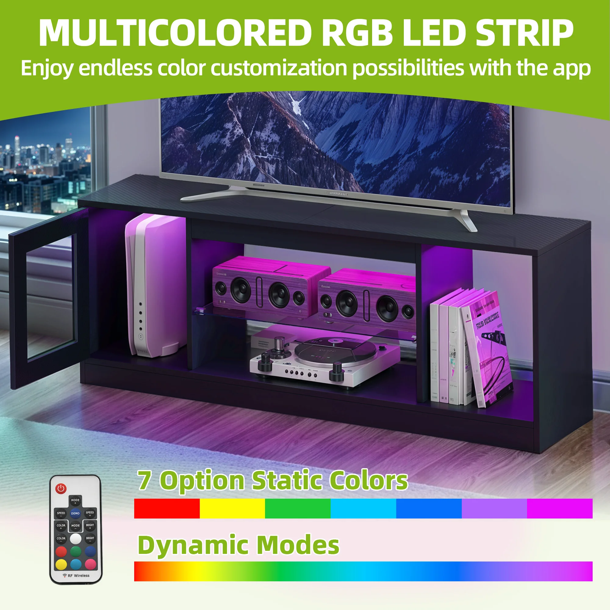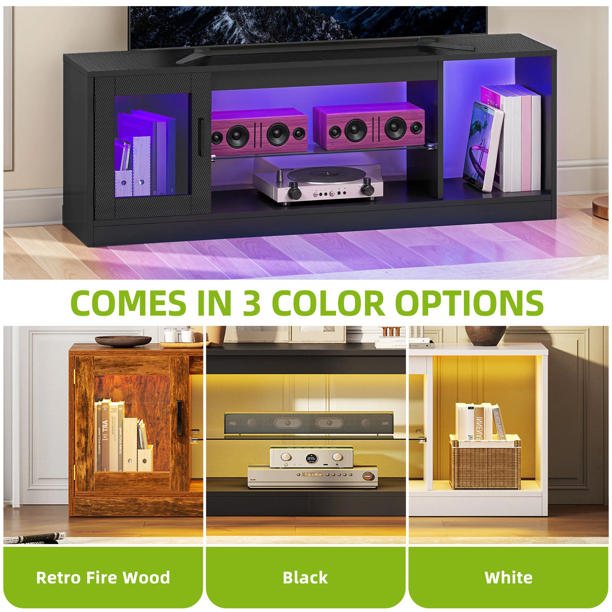 The spacious tabletop provides ample room for daily essentials, books, PlayStaion5, magazines, mugs, cups, and other electronic devices.Equipped with an ambient LED lighting system, the TV stand offers 15 static colors and 6 dynamic modes, controlled via a remote for a customizable atmosphere.