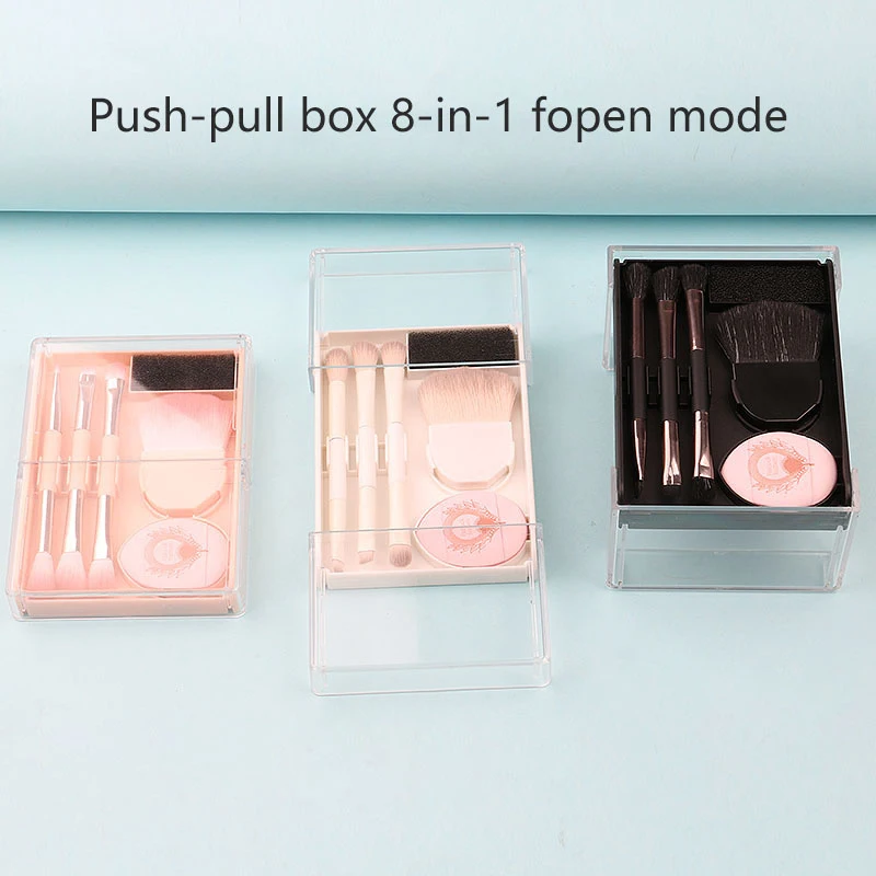 1. Our portable makeup brush set includes a range of essential brushes and a powder puff, designed to make makeup easy and efficient anytime, anywhere.