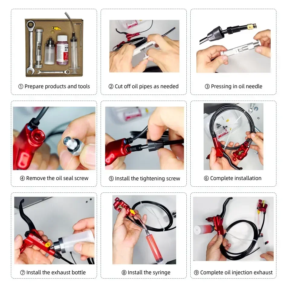 ⑦ Install the exhaust bottle>>>⑧ Install the syringe>>>⑨ Complete oil injection exhaust